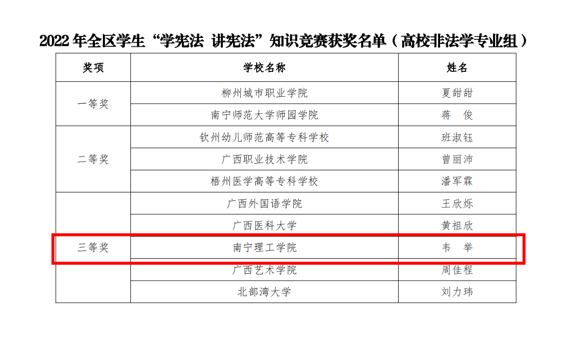10月29日,由广西壮族自治区教育厅主办的2022年全区学生“学宪法 讲宪法”知识竞赛在线上举行。我校参赛选手来自商学院的韦举同学勇夺知识竞赛高校非法学专业组三等奖。