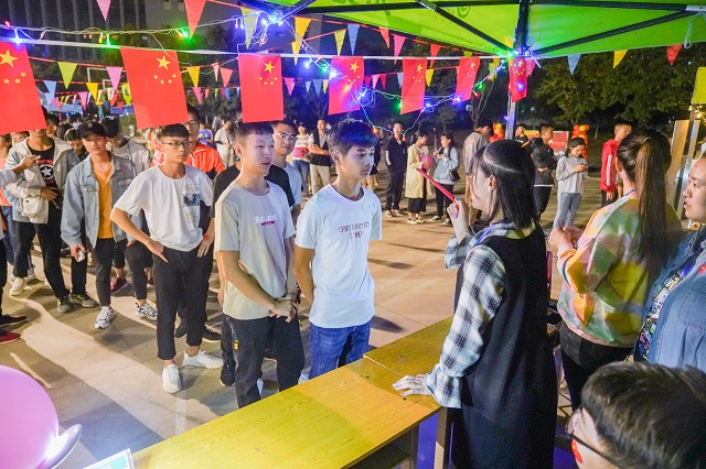 首先,角色扮演者身穿改革开放以来具有鲜明代表人物的服饰在校园街道为同学们送去小礼品,使更多的同学了解并参与到游园活动中。在主持人的宣布下,各社团根据自己的特色带来了精彩表演。随后,同学们纷纷加入到“爱国接力”、“国旗在我心”、“红旗飘飘”等爱国的小游戏中。游戏比赛在同学们的一阵一阵的呼喊声中达到高潮。此外,为了活跃现场气氛,添加了幸运大抽奖环节。最后,活动也在充满活力的兔子舞中落下帷幕。