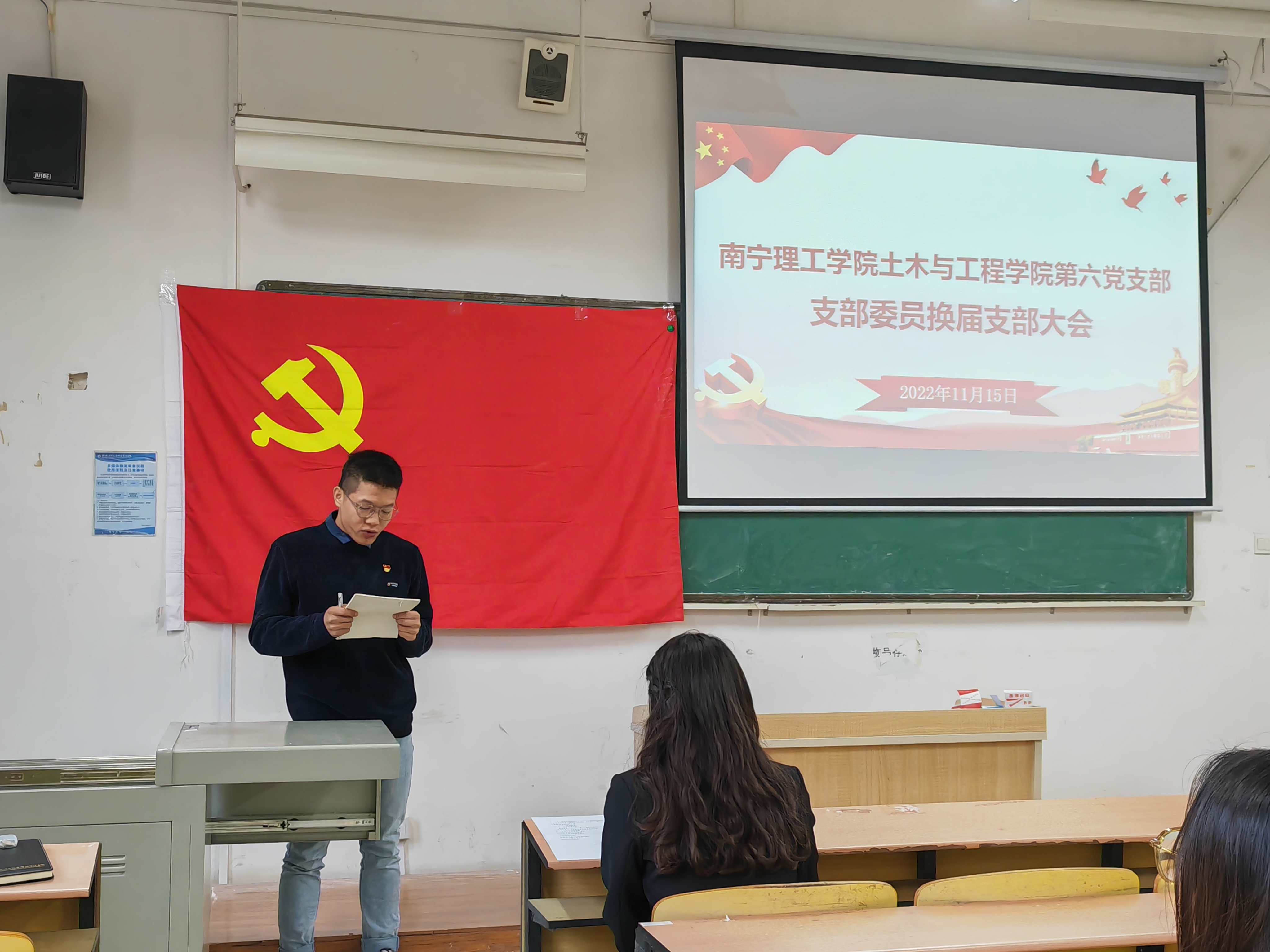 2022年11月15日,土木与工程学院第六党支部在4111教室召开支委换届选举会议。支部全体党员同志参与本次会议。会议由郑芸昕老师主持。