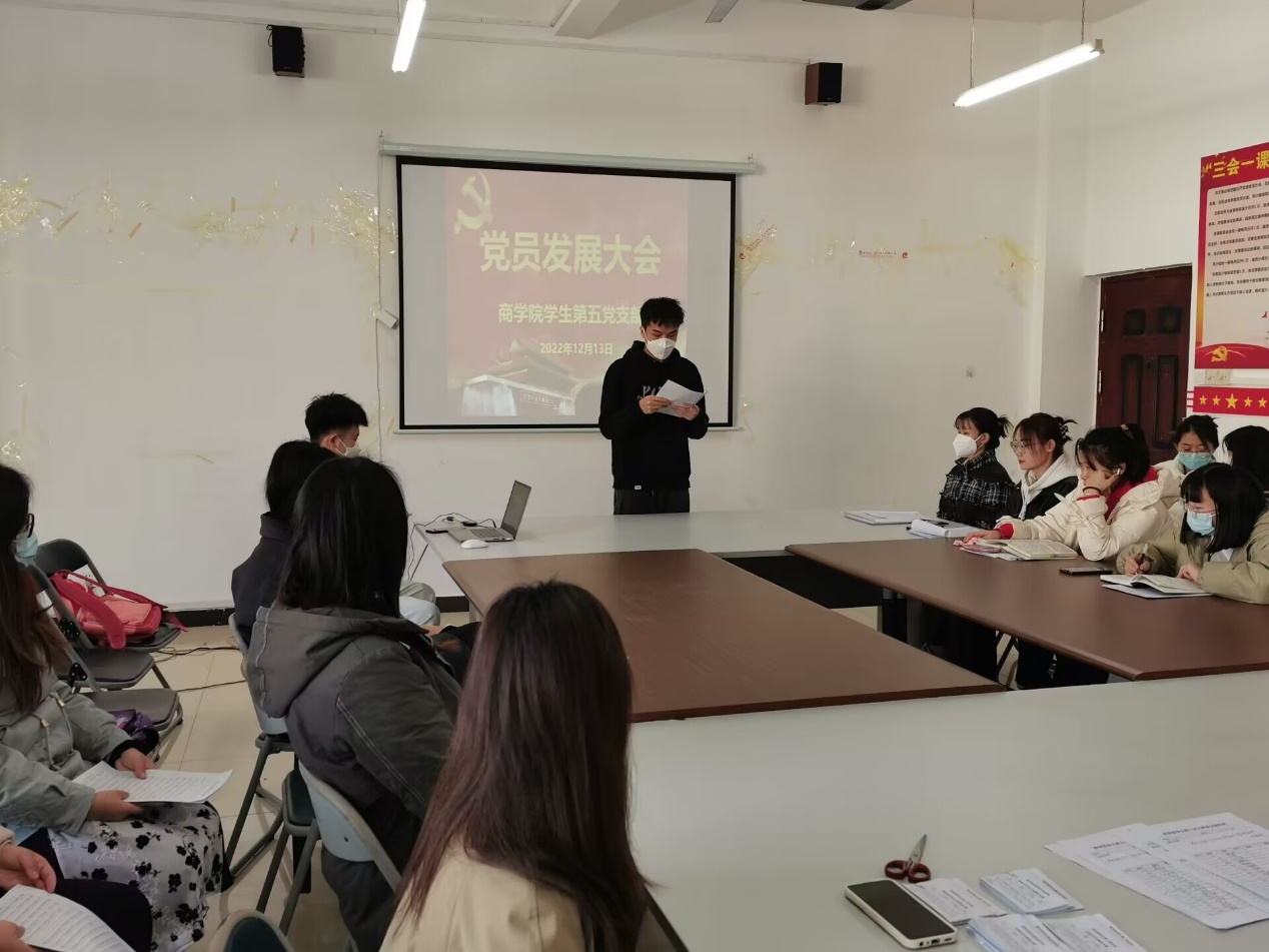 为进一步加强和推进党员队伍建设,切实提高党员发展质量,保持党员队伍的先进性和纯洁性,2022年12月13日商学院学生第五党支部在1410会议室召开预备党员接收大会。参加本次会议有支部书记谢启禧同志及全体学生党员,会议围绕冯雅婷等2名同志转为中共预备党员进行讨论和表决。