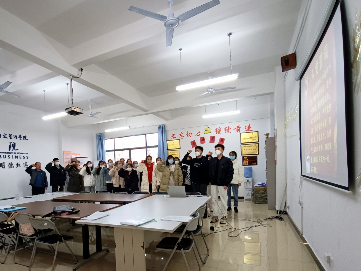 最后,在支部书记谢启禧同志的带领下,重温入党誓词;同时支部书记谢启禧同志对全体党员提出了几点期望:一是要在思想及行动各方面严格要求自己,全面提升个人能力;二是希望全体党员同志积极落实就业问题,并且帮助其他同学,起到模范先锋带头作用;三是疫情当下,做好防护措施,确保个人健康。