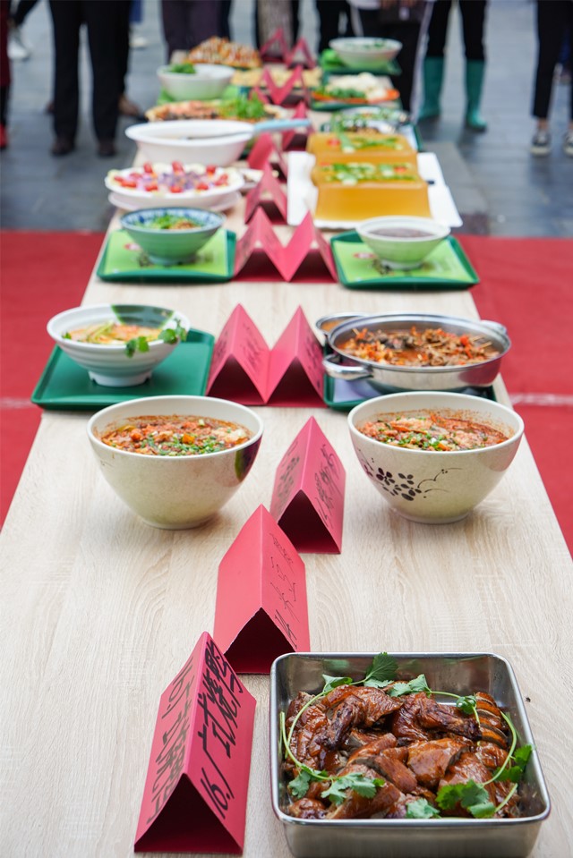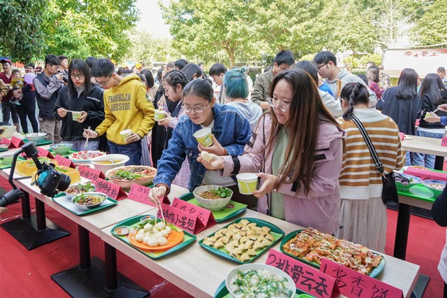 活动开始前,学校伙食管理委员会的工作人员便将参与此次风味小吃评选活动的美食一一摆放在了长桌上,这些美食分别由1#食堂和2#食堂各大窗口提供,共47道风味小吃,口味囊括南北,制作工序各有不同,均色香味俱全。其中,极具广西特色的螺蛳粉、桂林米粉,带着北方风味的酱香饼,四川口味的麻辣拌和烤鱼以及广式烧鸭一亮相便深受现场师生的喜爱。