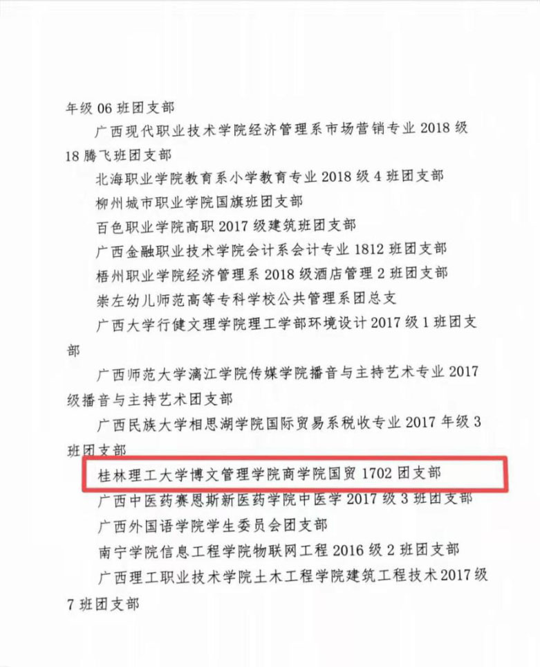 据悉,本次遴选共有100个团支部被评为2019年广西高校“活力团支部”。我校国际经济与贸易1702团支部被评为“活力团支部”,这是对我校团支部建设的肯定,同时也是激励我校团支部不断完善自身向前发展的动力,为我校团支部建设打下良好的基础。