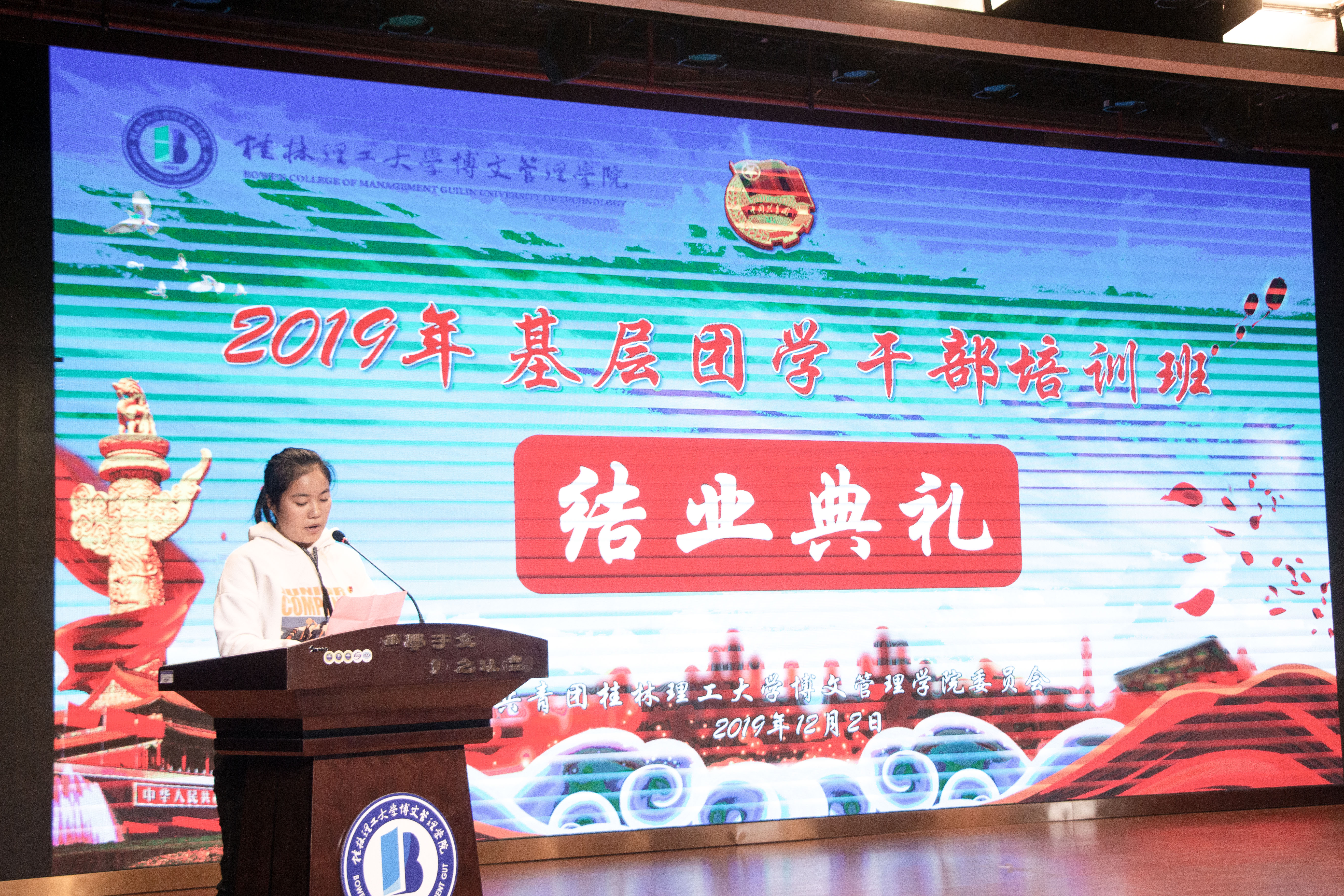 12 月 2 日中午,我校在一栋报告厅举行 2019 年基层团学干部培训班结业典礼,各二级学院分团委学生副书记、组织部部长以及培训班全体学员出席典礼。