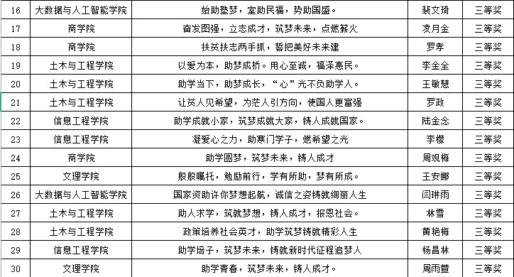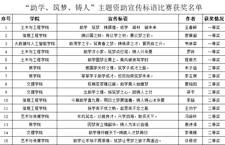 本次活动共征集了资助宣传标语60条,经组织评选,最终玉春鲜等5位同学在评选活动中荣获一等奖,朱子涵等10位同学荣获二等奖,裴文琦等15位同学荣获三等奖。