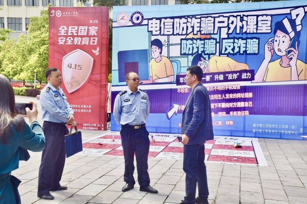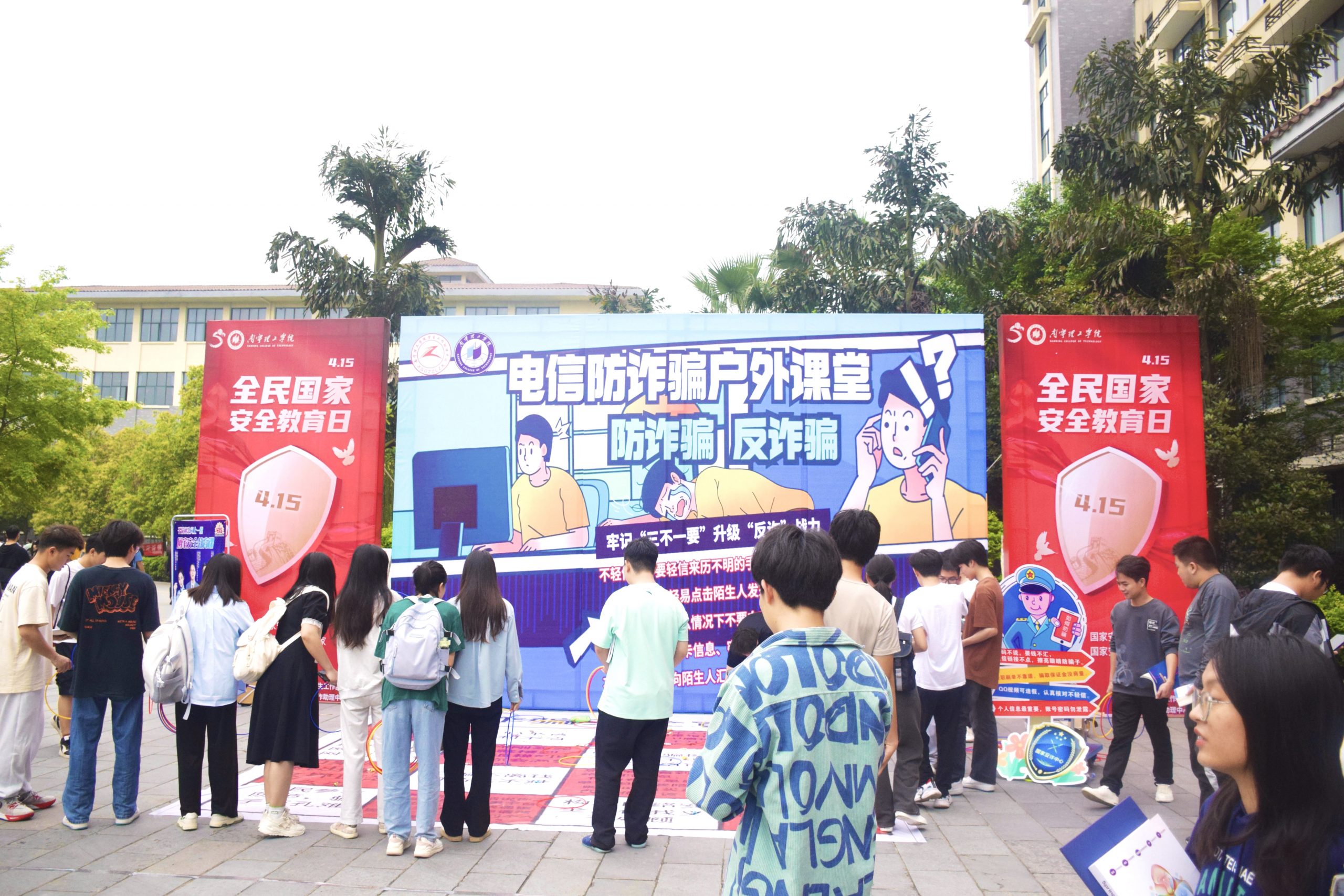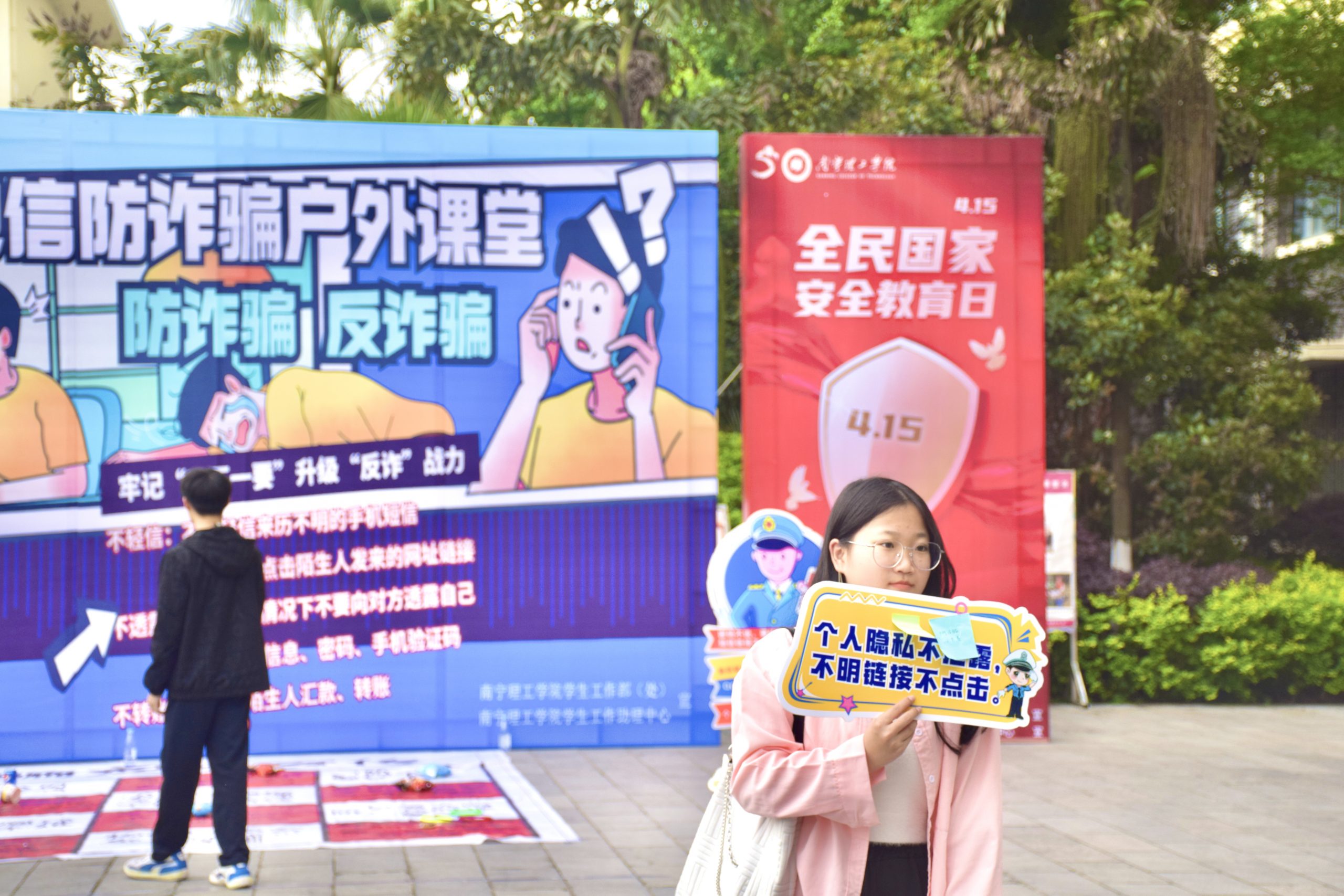 南宁理工学院美好生活“YUE·社区“建设工作开展以来,学校聚焦学生个性化、差异化需求,搭建符合学生身心发展特点的多样化、多主题成长支持平台、场地,着重融合思政育人元素,彰显学校特色文化。为做好4.15国家安全教育工作,同时落实网络安全教育与电信防诈安全月的教育要求,对日益猖獗的网络诈骗犯罪发起全面反击,构筑多元化、矩阵式网络宣传阵地,4月13日上午,由学校党委学生工作部举办的“关注防诈骗防诈骗,共创平安校园”国家安全教育日暨校园电信反诈骗户外互动课堂活动在南宁理工学院至臻楼广场举行。借助寓教于乐的素拓互动形式,让同学们熟悉和牢记多种诈骗套路,把反诈防范技巧入脑入心!