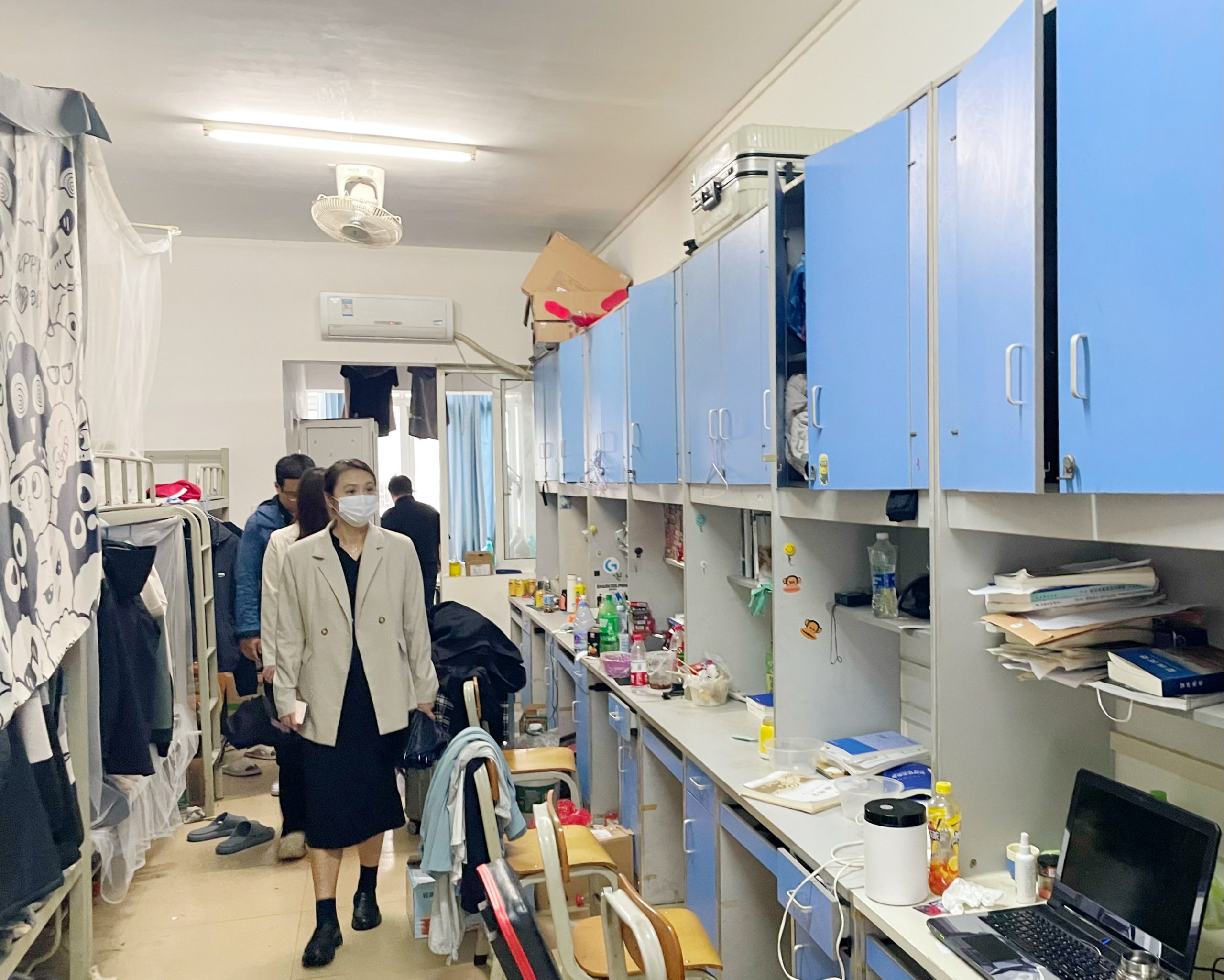 在对学生宿舍进行检查前,学生工作部(处)部(处)长李枚晏就检查重点做出强调。假期学生管理安全责任重大,不仅要了解学生的生活情况,还要叮嘱其注意交通出行、个人财产、电信防诈等方面的安全,同时提醒学生要及时排查宿舍安全问题,禁止使用大功率电器,在离开学校前务必检查宿舍用水用电的安全问题情况。随后,各检查组分头行动,围绕6、7、8、9、10、11栋等宿舍区域以及学生学习区域进行全面检查。