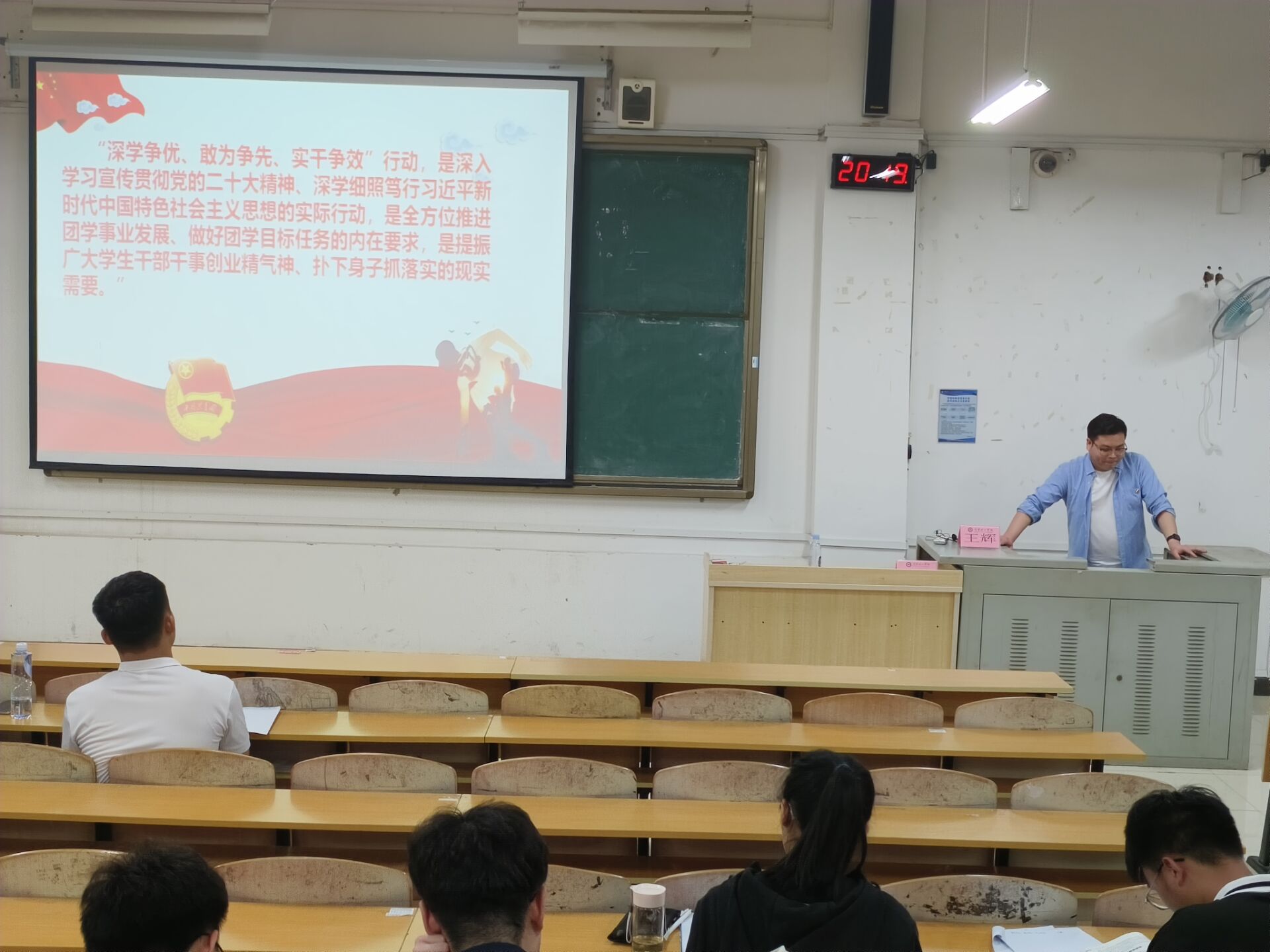 王辉老师详细介绍“深学争优、敢为争先、实干争效”是深入贯彻党的二十大精神,深学细照笃行习近平新时代中国特色社会主义思想的实际行动。王辉老师讲道:学生干部应积极响应,怀着对学生工作的高度热情去迎接任务,守正创新,奋发图强,是新时代青年应有的品质。王辉老师的话深深触动了我院学子,激励着学子们一起努力,一起成长。