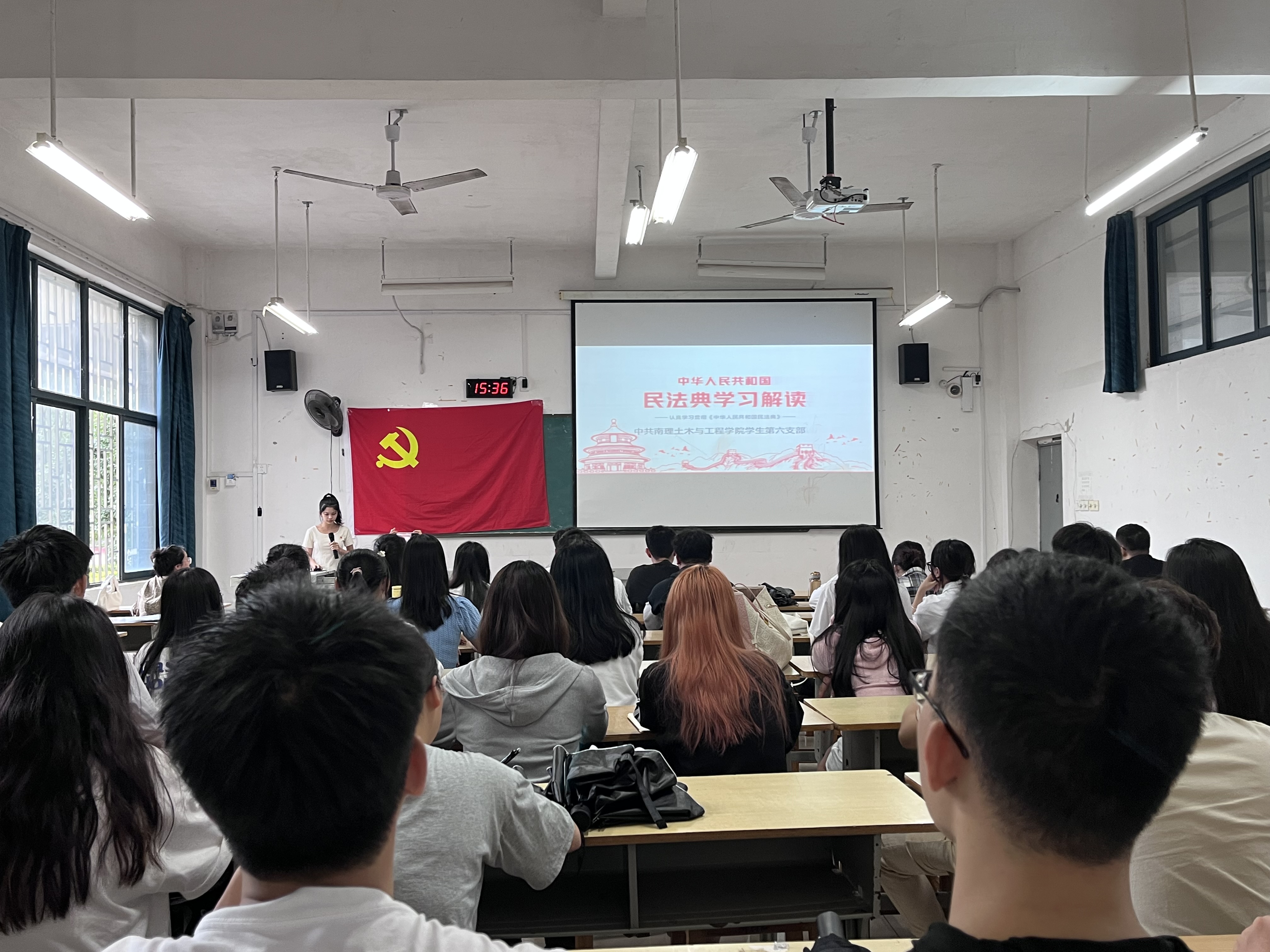为了深入落实关于《民法典》学习宣传的重要指示精神,弘扬法制精神。2023年5月25日下午15点,我院学生第六党支部在4108召开“典亮生活,伴你同行”主题党日活动。此次活动由彭鑫同志主持,支部全体党员参加。