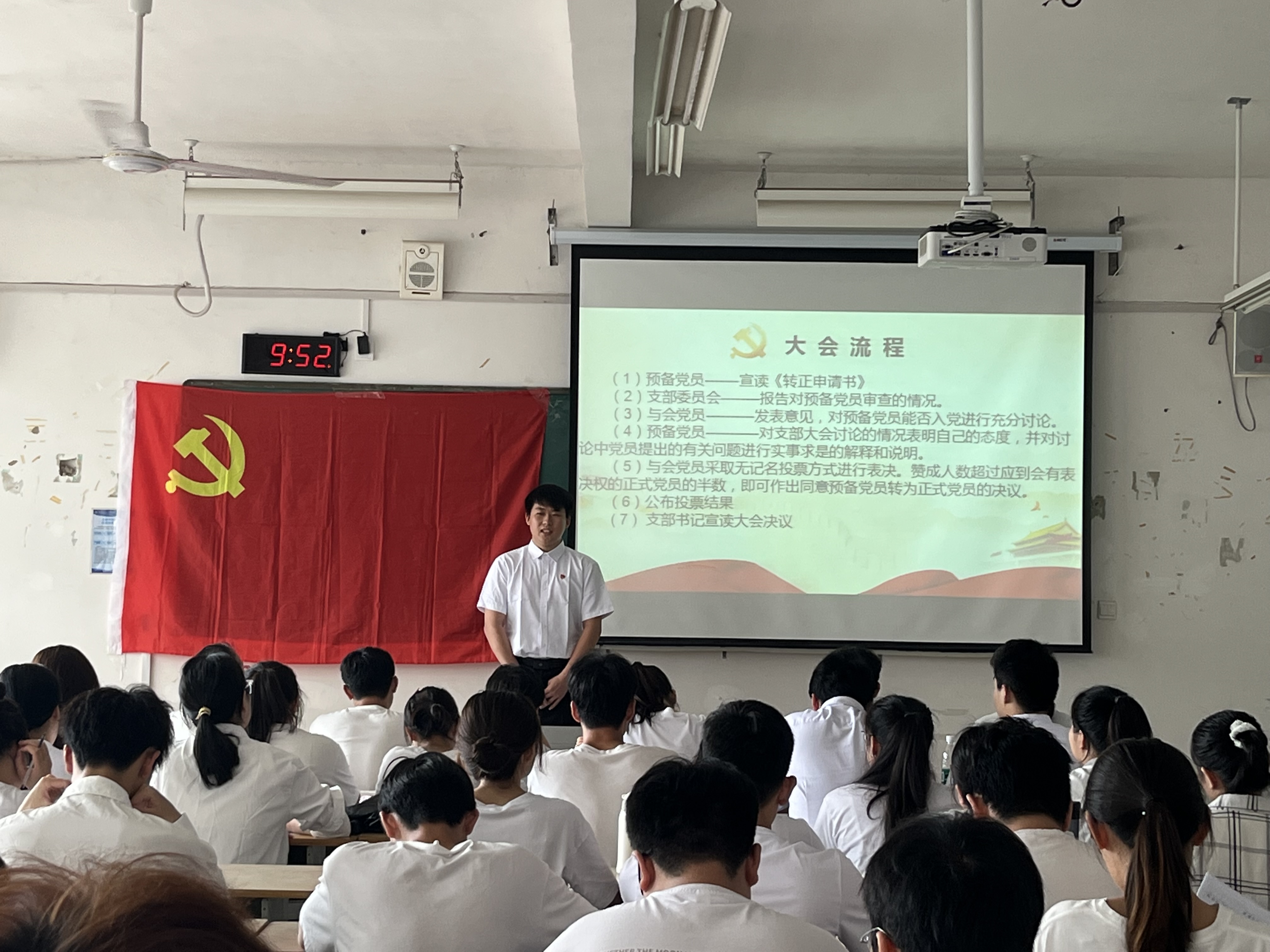 为注入我支部新血液,新力量。2023年6月1日,我院学生第九党支部在4208教室召开预备党员转正大会,支部全体党员、预备党员参会,会议由支部书记武丽俊同志主持。