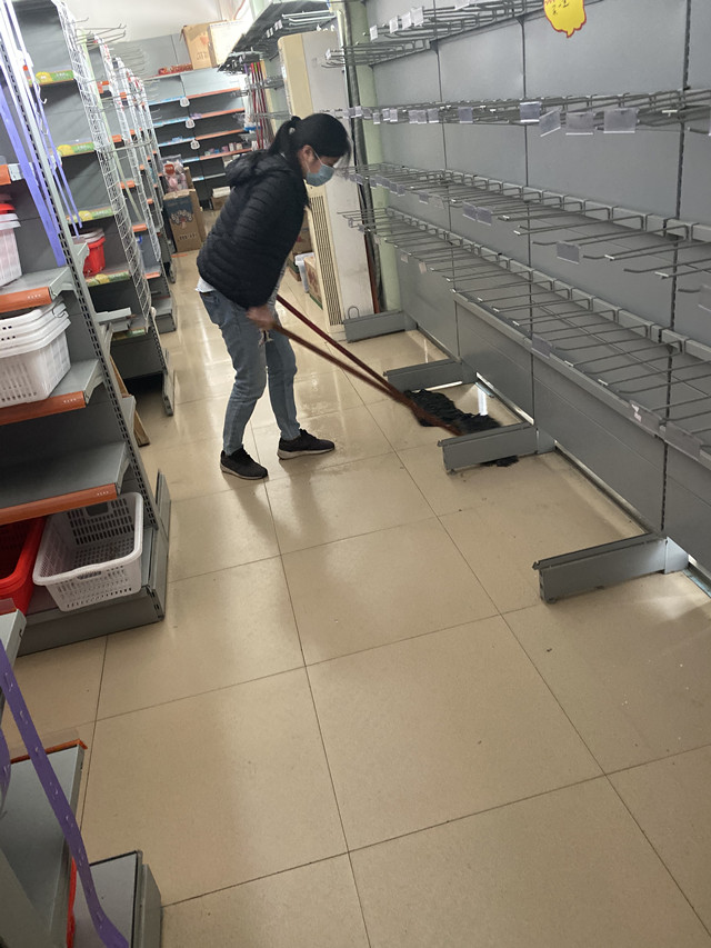 商业门面工作人员对店面进行全面消杀
