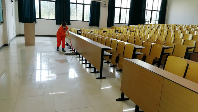消杀现场,消毒人员分别对校园内教学楼、办公楼以及公寓楼的周边环境,楼内公共大厅、宿舍盥洗室、卫生间、走廊、楼梯间、楼梯扶手、门把手等人员接触较多的区域进行全面的卫生清理、消毒、通风,不放过任何死角,实现校园消杀全覆盖,确保校园卫生环境安全。食堂的工作人员分别对食堂的就餐大厅、操作间、备餐间、仓库等进行了全面清洗消毒;商户提前对门面内外环境、货柜等进行了清理和消毒,对临近过期和已过期的食品、原辅料进行清库处理,确保开学后师生饮食卫生安全。