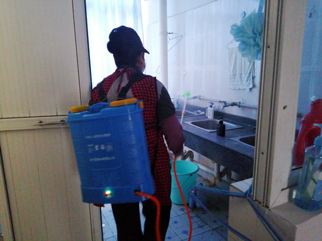 公寓保洁员对学生宿舍盥洗室进行消杀