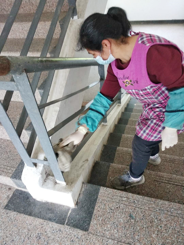 公寓保洁员对公寓楼梯进行擦拭消毒