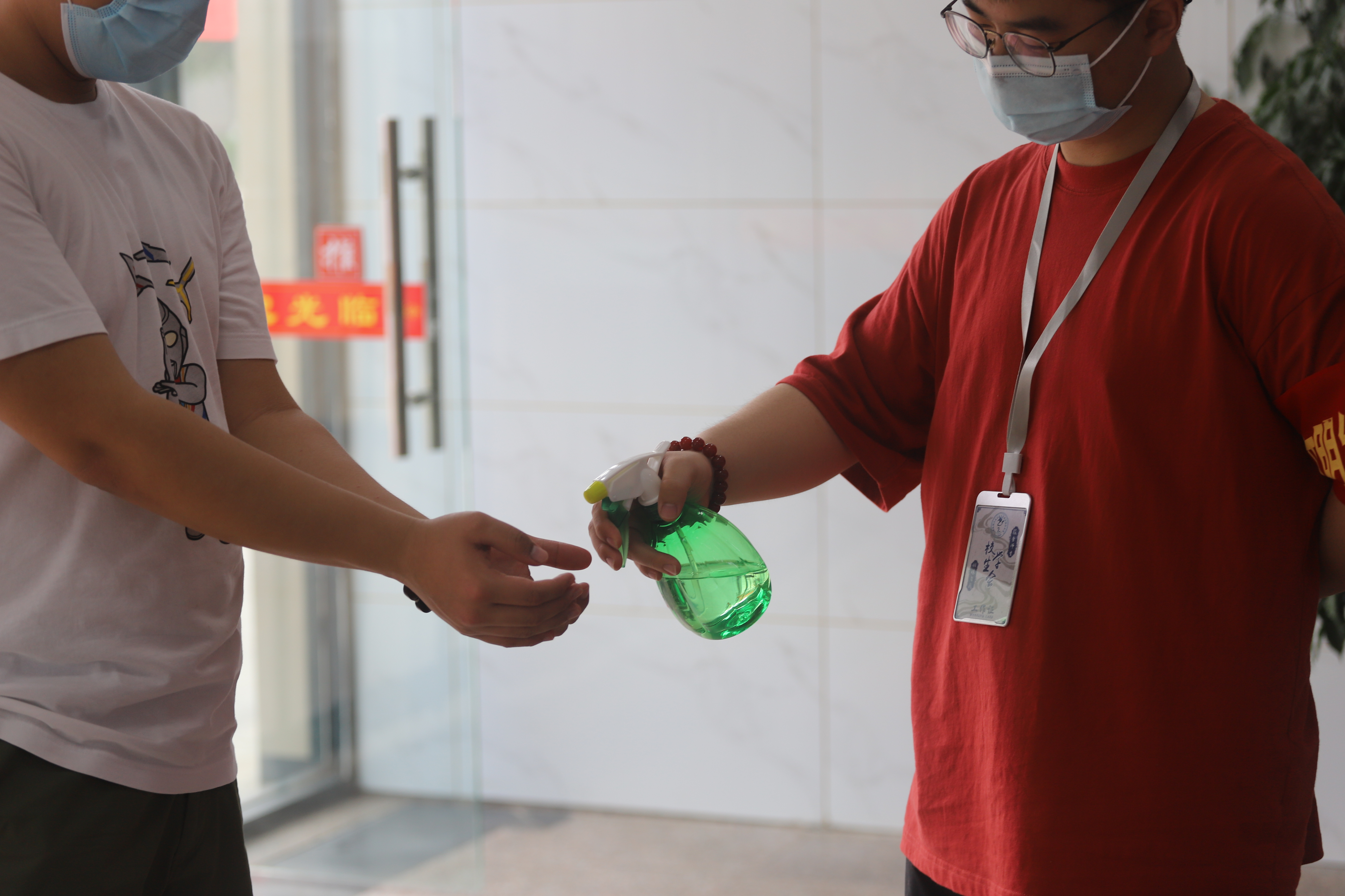 志愿者给就餐同学消毒