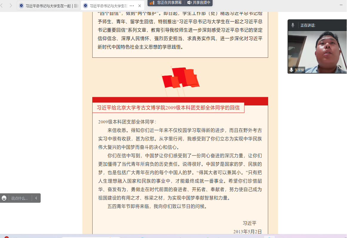 学习分享会上,全体学生党员回顾了《习近平给北京大学考古文博学院2009级本科团支部全体同学的回信》及《习近平给华中农业大学“本禹志愿服务队”的回信》详细了解两封回信的背景。
