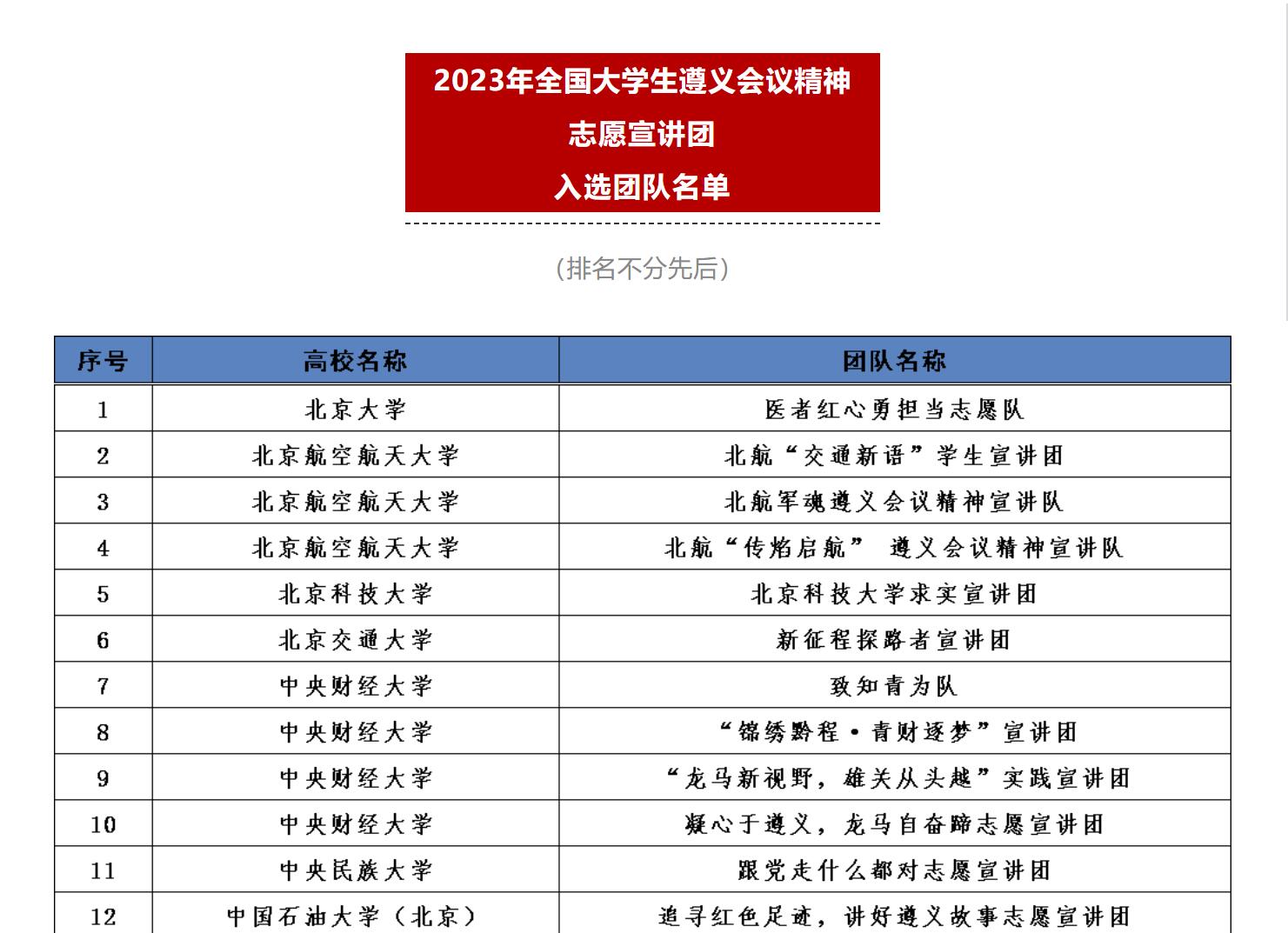全区共21支团队成功入选,我院文理知行宣讲团、青春笃行志愿宣讲团2支宣讲团队连同学校筑梦心语队、石榴籽实践团共同入选2023年全国大学生遵义会议精神志愿宣讲团。