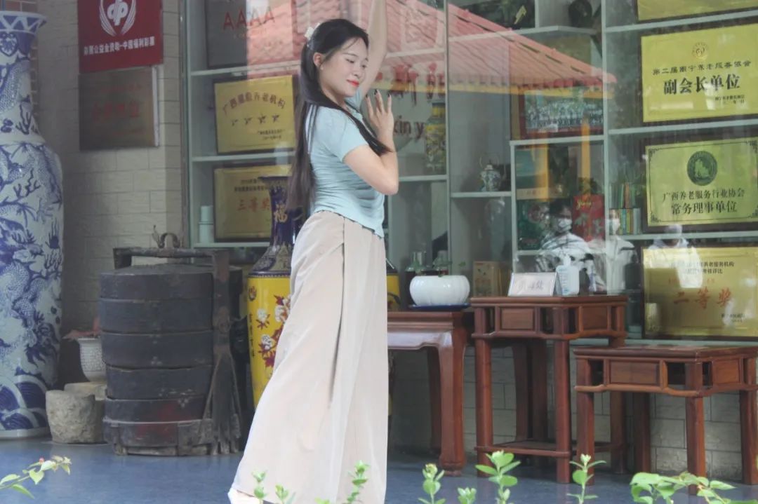 温婉的古典舞《青山赋》拉开了文艺汇演的序幕。轻柔的舞姿配以甜美的笑容,温和而有力,紧紧抓住爷爷奶奶的目光,在座皆赞叹不已。