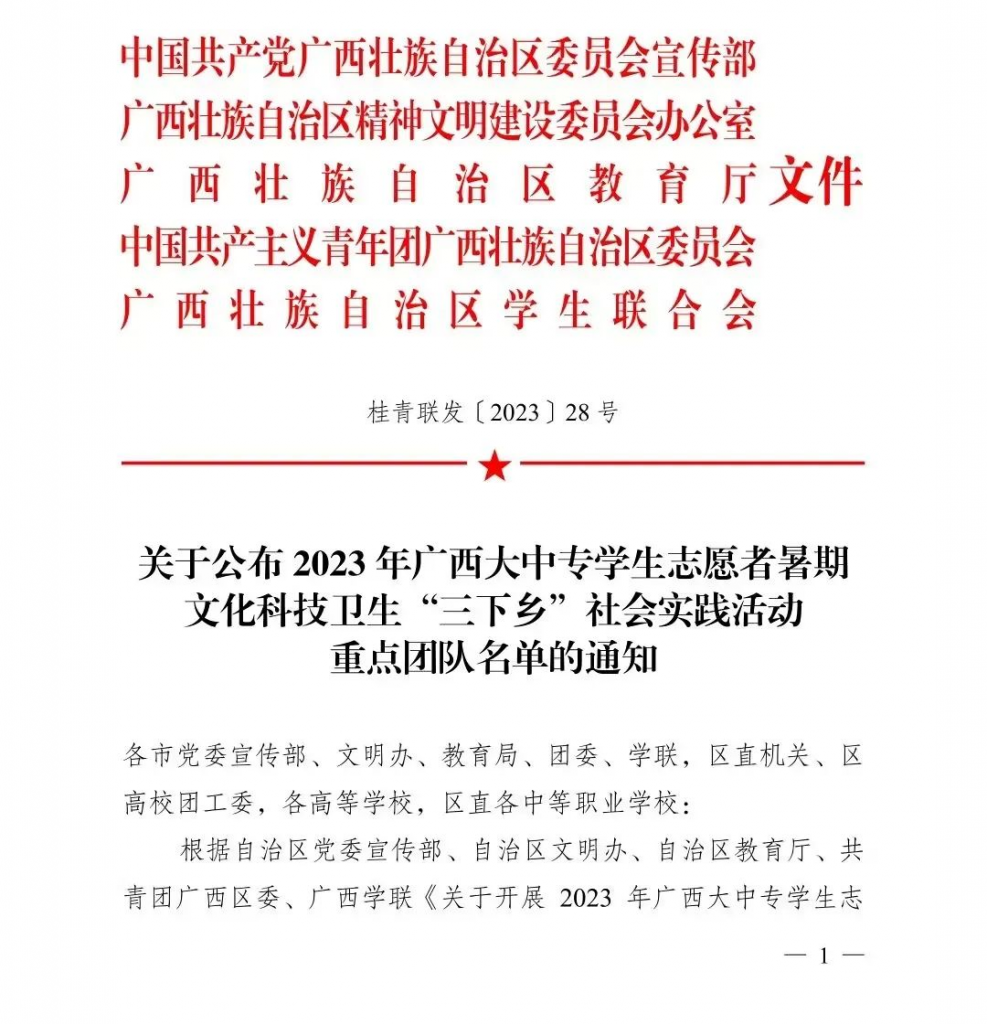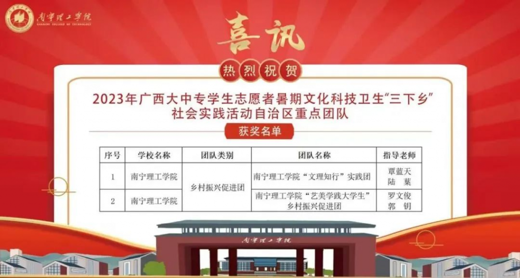 喜讯|南宁理工学院两支团队获2023年广西大中专学生志愿者暑期文化科技卫生“三下乡”社会实践活动自治区重点团队