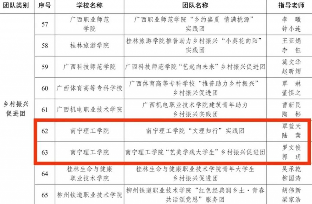 根据自治区党委宣传部、自治区文明办、自治区教育厅、共青团广西区委、广西学联《关于开展2023年广西大中专学生志愿者暑期文化科技卫生“三下乡”社会实践活动的通知》要求,经学校申报、材料审核、评议研究,最终评出2023年广西大中专学生志愿者暑期文化科技卫生“三下乡”社会实践活动全国重点团队68支、自治区重点团队200支。南宁理工学院“文理知行”实践团、“艺美学践大学生”乡村振兴促进团入选2023年广西大中专学生志愿者暑期文化科技卫生“三下乡”社会实践活动自治区重点团队。