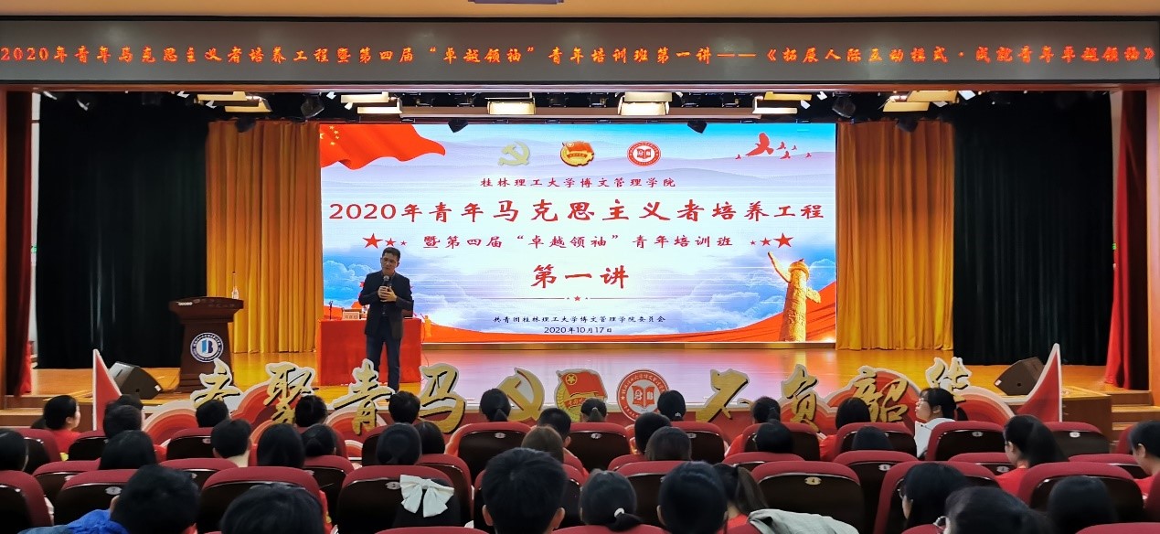 10月17日上午,2020年青年马克思主义者培训工程暨第四届“卓越领袖”青年培训班第一讲《拓展人际互动模式·成就青年卓越领袖》在1626报告厅顺利开讲。桂林航天工业学院学生事务管理服务科科长邓嘉超主讲,全体青马班学员参加本次课程。