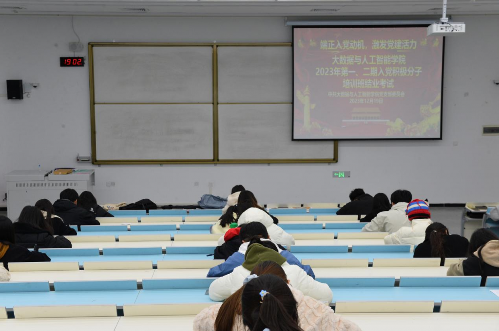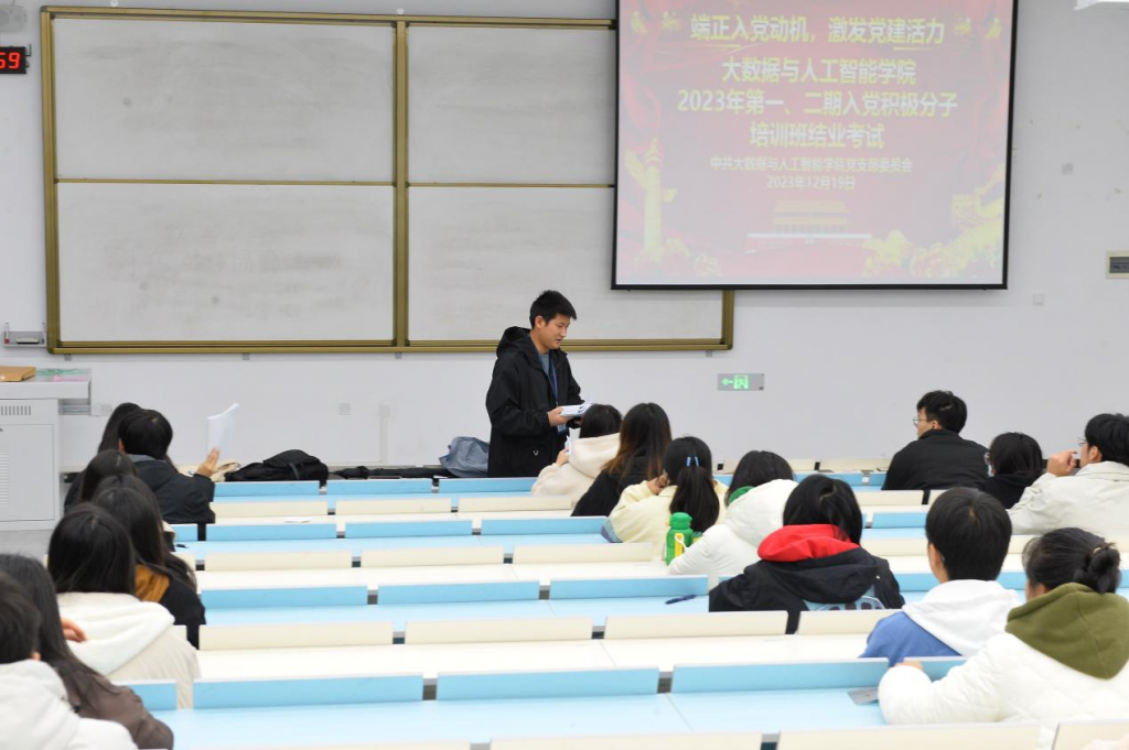 为检验入党积极分子的思想理论修养和培训学习成果,进一步加强入党积极分子队伍的建设,严格把关党员发展质量关口,我院于12月19日在A3418教室开展第一期、第二期入党积极分子理论考试。本次考试全员参与,班主任梁业武担任监考员。