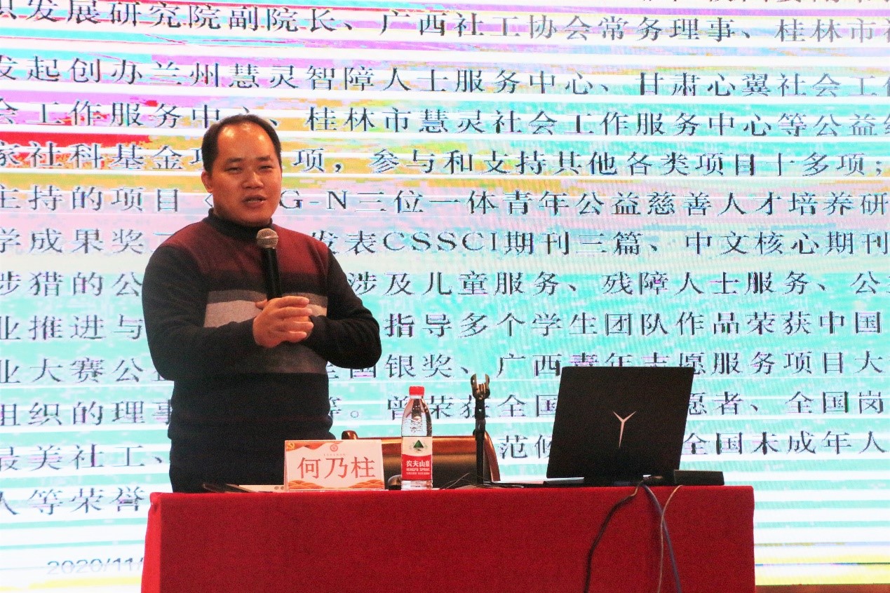 何乃柱,中共党员,民族社会学博士、硕士研究生导师,中级社工师,硕士和博士毕业于教育部人文社科重点研究基地兰州大学西北少数民族研究中心。现任广西师范大学校团委副书记、社会工作教研室主任,中国-东盟青年社会组织发展研究院副院长、桂林法律志愿者协会副会长、广西社会工作协会常务理事等;创办桂林市慧灵社会工作服务中心、广西厚生社会工作服务中心、桂林市社会工作协会等公益组织。主持国家社科基金2项、其它各类课题10多项,发表论文约15篇、参编参著教材著作5部。