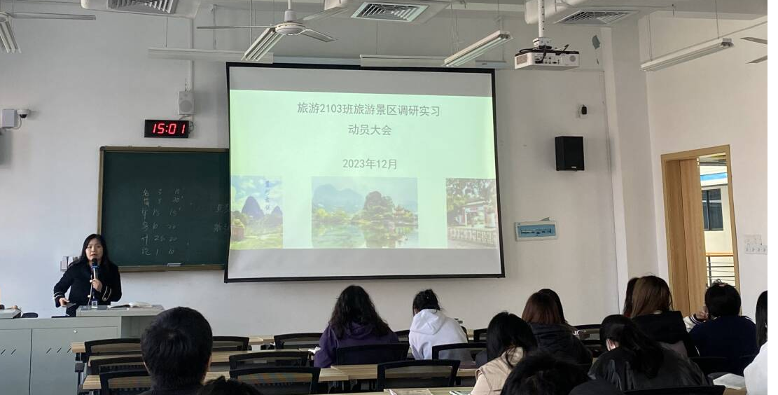 12月20日在东盟校区A4105教室,梁淑媚老师主持召开了《旅游景区调研实习》动员大会,翟丽蓉、王莹老师及旅游2103班全体同学参加此次大会。会上,梁淑媚老师讲解了《旅游景区调研实习》的分组、实践前期资料查阅收集、调研问卷设计等相关问题,并交代了外出实习的安全事项和具体的行程安排。2024年1月3日-4日及1月10日,经学校及学院同意,我院旅游管理专业师生前往靖西旧州古镇、鹅泉景区以及武鸣江宇梦想小镇进行调研。在调研中,学生们认真听景区讲解员讲解,并对景区游客进行访谈、发放问卷,以更好地了解游客对景区运营的看法和建议。1月10日晚上,本次实习教学活动的全体师生们开展了实习总结会,各组同学以视频与PPT相结合的讲解形式对调研实习过程中的收获与体会进行汇报演示,也表达对学校、学院精心安排实践活动的感恩之情。会后,各组同学根据指导老师提出相关的意见和建议修改完善实习报告并进行提交。
