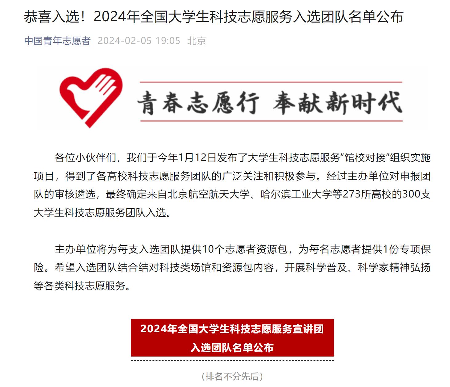 近日,中国青年志愿者公众号公布《2024年全国大学生科技志愿服务入选团队名单》,科技志愿服务宣讲团活动由中国青年志愿者协会、中国科学技术协会宣传文化部主办,面向全国高校公开招募,经主办方审评,全国共有北京航空航天大学、哈尔滨工业大学等273所高校的300支大学生科技志愿服务团队入选。