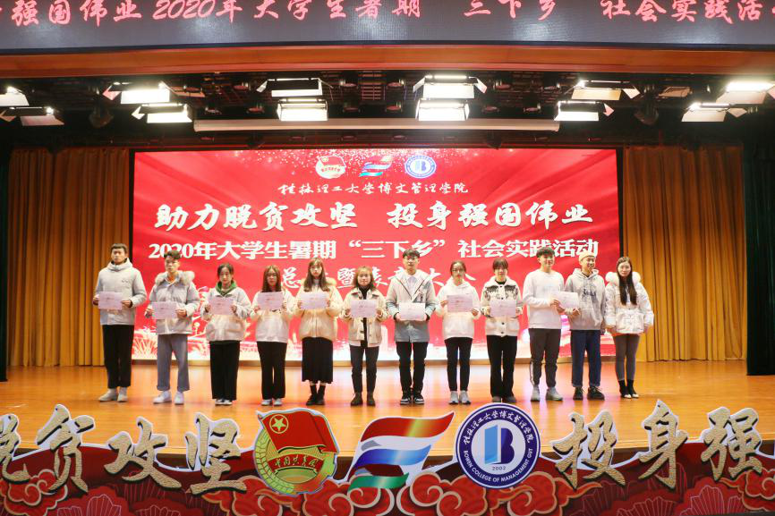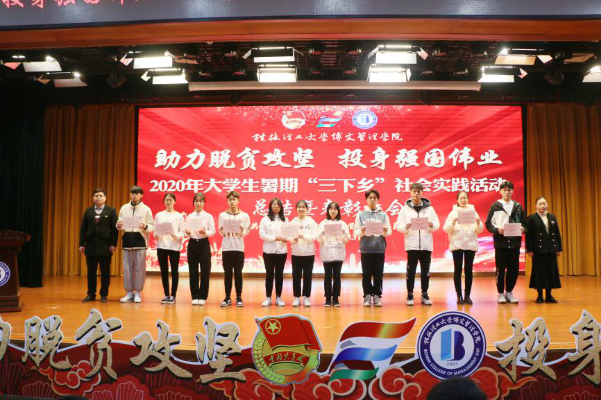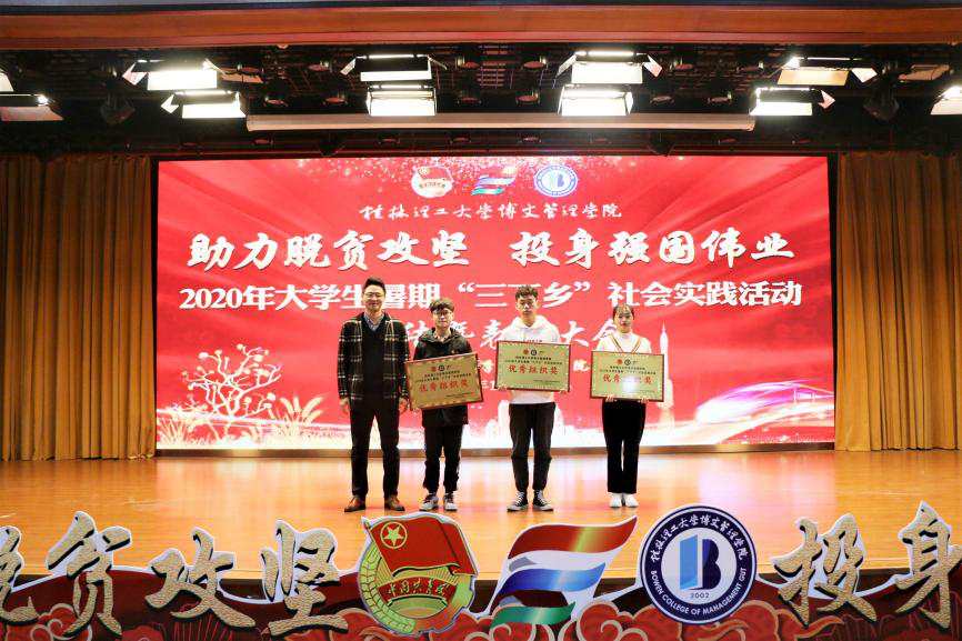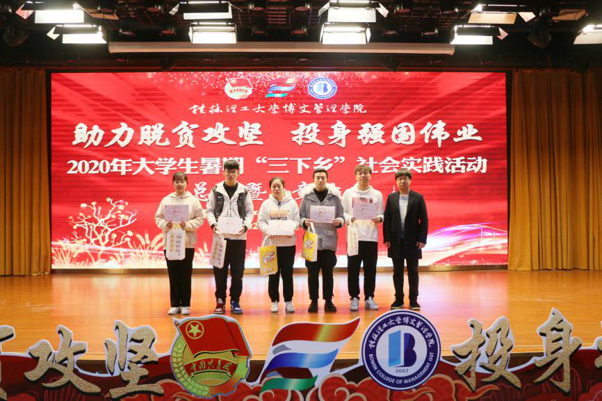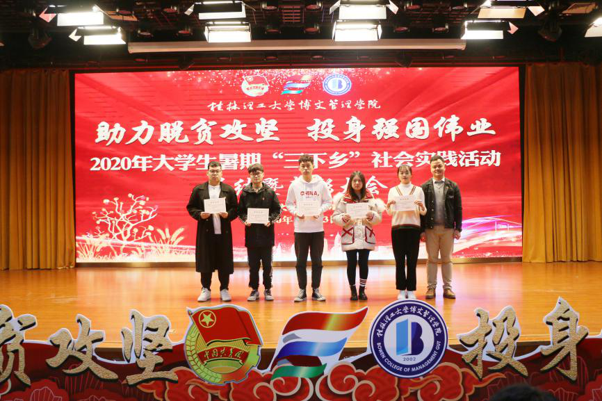 首先,老师宣读《关于表彰桂林理工大学博文管理学院2020年大学生暑期“三下乡”社会实践活动先进集体和个人的决定》,到场嘉宾分别为他们颁奖。