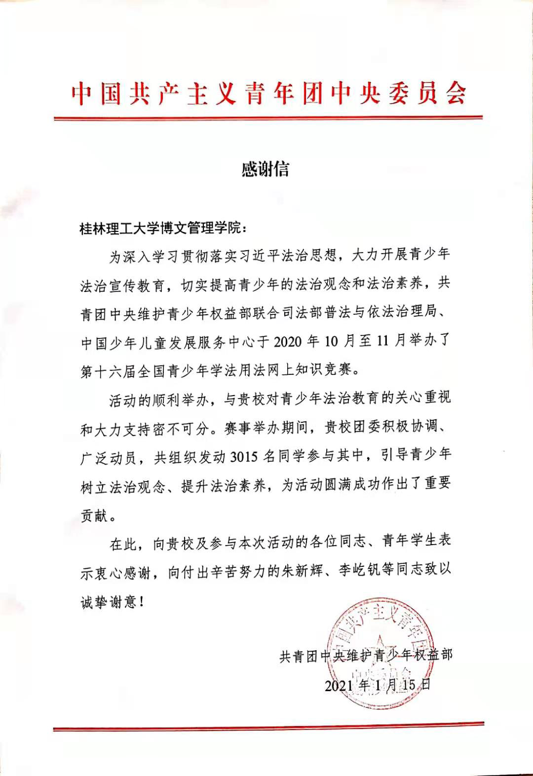近日,在团中央维护青少年权益部主办的第十六届全国青少年学法用法网上知识竞赛中,我校荣获“优秀组织奖”,并收到团中央维护青少年权益部发来的感谢信!