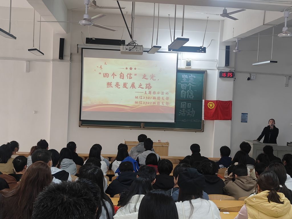为了学习贯彻习近平总书记在全国“两会”期间的重要讲话精神,引导青年学生深刻感悟我国国家制度和国家治理体系的显著优势并坚定“四个自信”理念,我院地理信息科学2301班及2302班团支部于3月11日在4202教室开展了主题为“‘四个自信’之光,照亮发展之路”的团日活动,活动由地信2301班团支书常烁骐主持,辅导员龙舒桦和地信2023级全体同学参加。