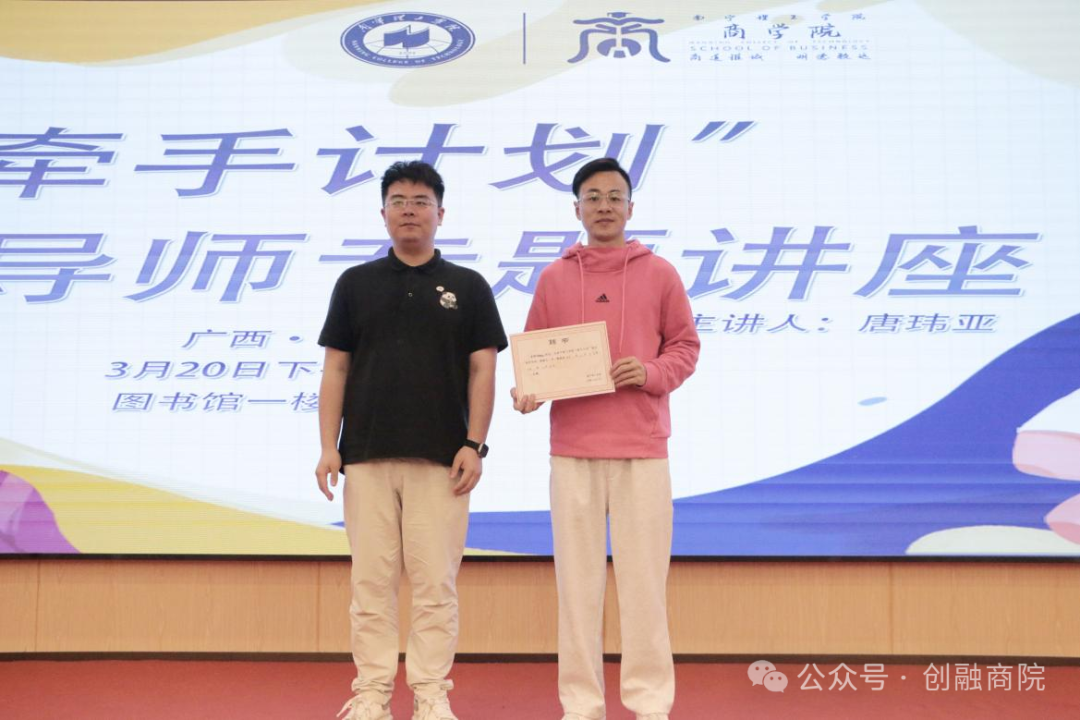 讲座最后,由商学院分团委副书记杨笑宇老师代表学院为唐玮亚校友颁发创新创业助学导师聘书,标志着学院在扶持学生创业和服务学生就业工作上又一重要收获,也标志着我院牵手计划工作正式进入实质推进阶段。
