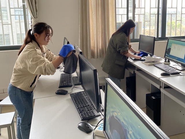 我院分团委学生会的同学们有序集合在教学楼下,分配好工作任务并分发劳动工具,依次前往分配好的学院教学行政办公室、辅导员办公室以及实验室2308、2310、2210进行仔细打扫,同学们在打扫过程中认真负责,不放过每个死角,卷起衣袖,认真擦拭窗户,清理杂物。在同学们的通力合作下,实验室和办公室变得干净整洁,本次清洁活动圆满完成。