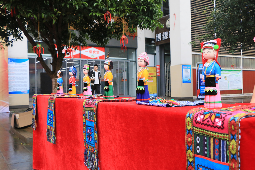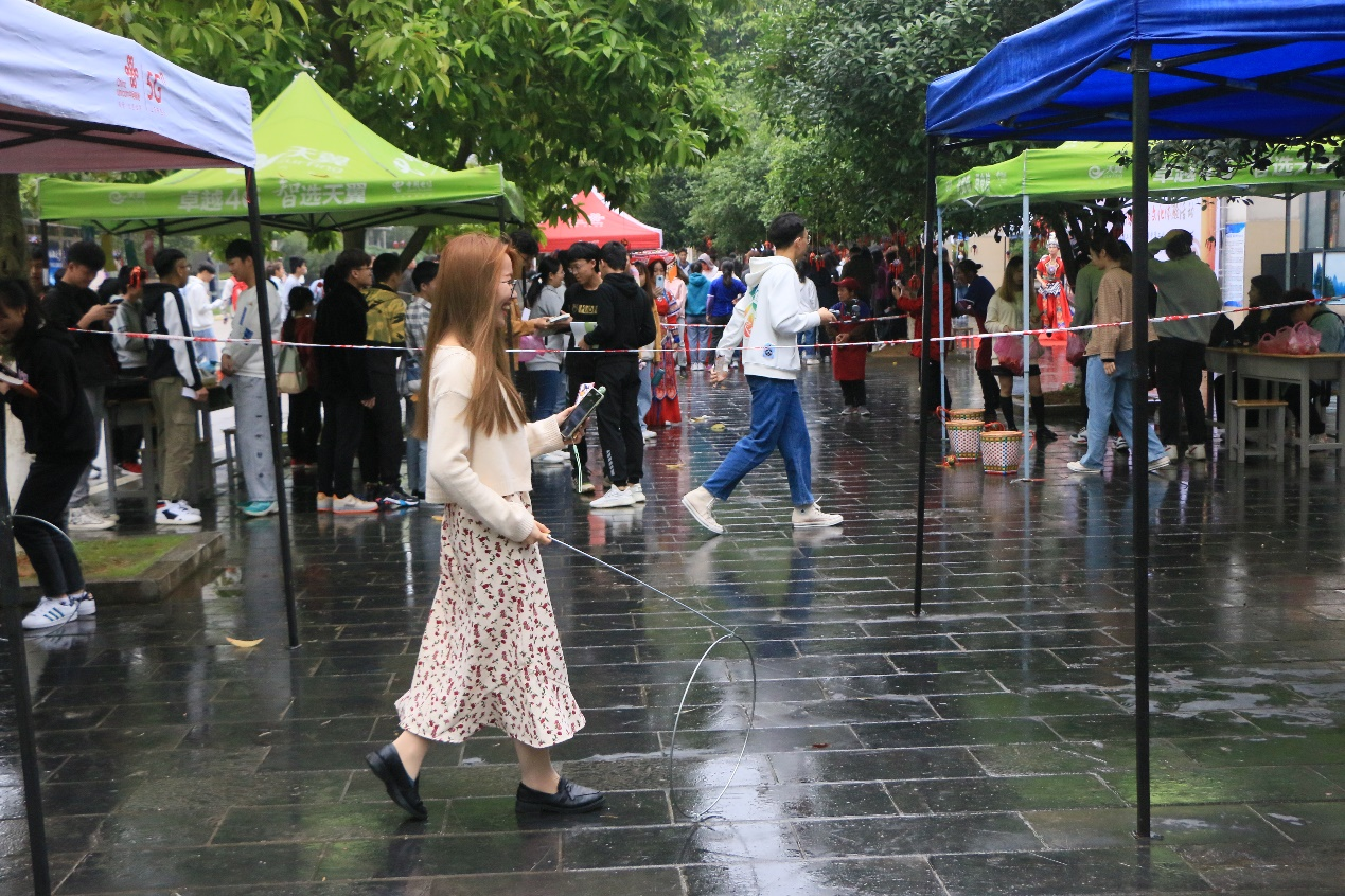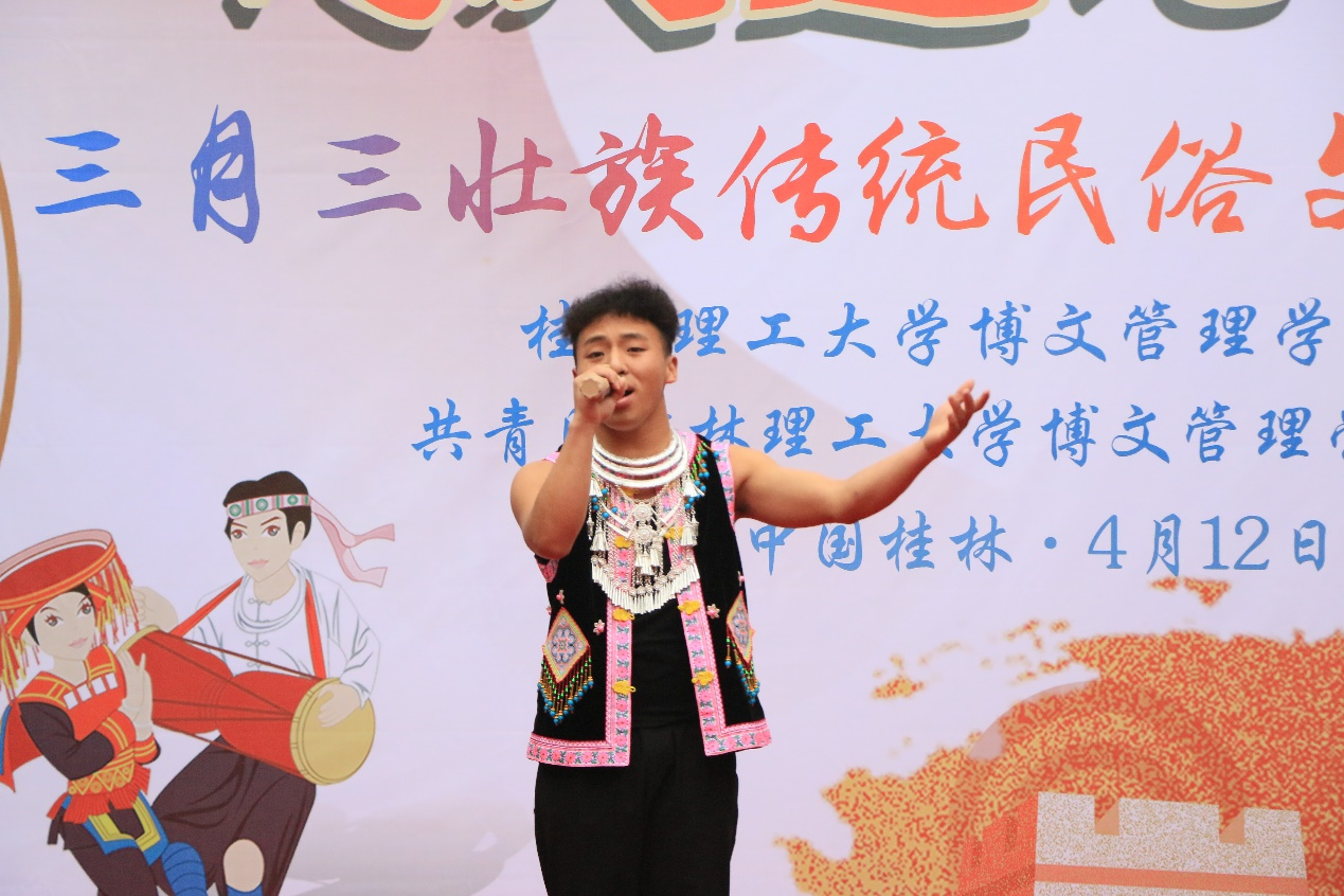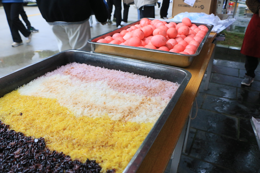 活动现场,身着壮族服饰的同学们载歌载舞,成为了校园里一道亮丽的风景线。摆放在展示区的绣球、铜鼓、人偶等手工艺品栩栩如生,生动地向大家展示着属于壮族的民族风情,让人眼前一亮。四个游戏环节,抛绣球、滚铁环、踏踏板、竹竿舞,也饱含壮族风韵,每一个游戏都能够让同学们乐在其中。壮族传统美食,红鸡蛋、五色糯米饭、还有香甜软糯的青团,在场的领导嘉宾以及同学们都品尝后都赞不绝口,在品尝美食的同时工作人员还为大家详细地介绍了制作美食的原料和方法以及蕴含其中的壮族人民美好的祝愿。