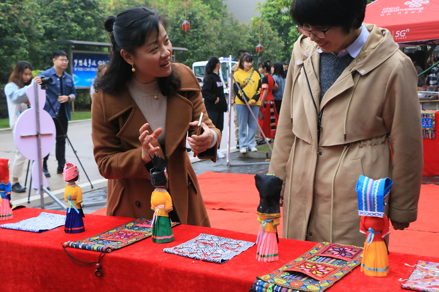 党委副书记邓雪梅、校长助理杨鲜丽在工艺品展区驻足观看