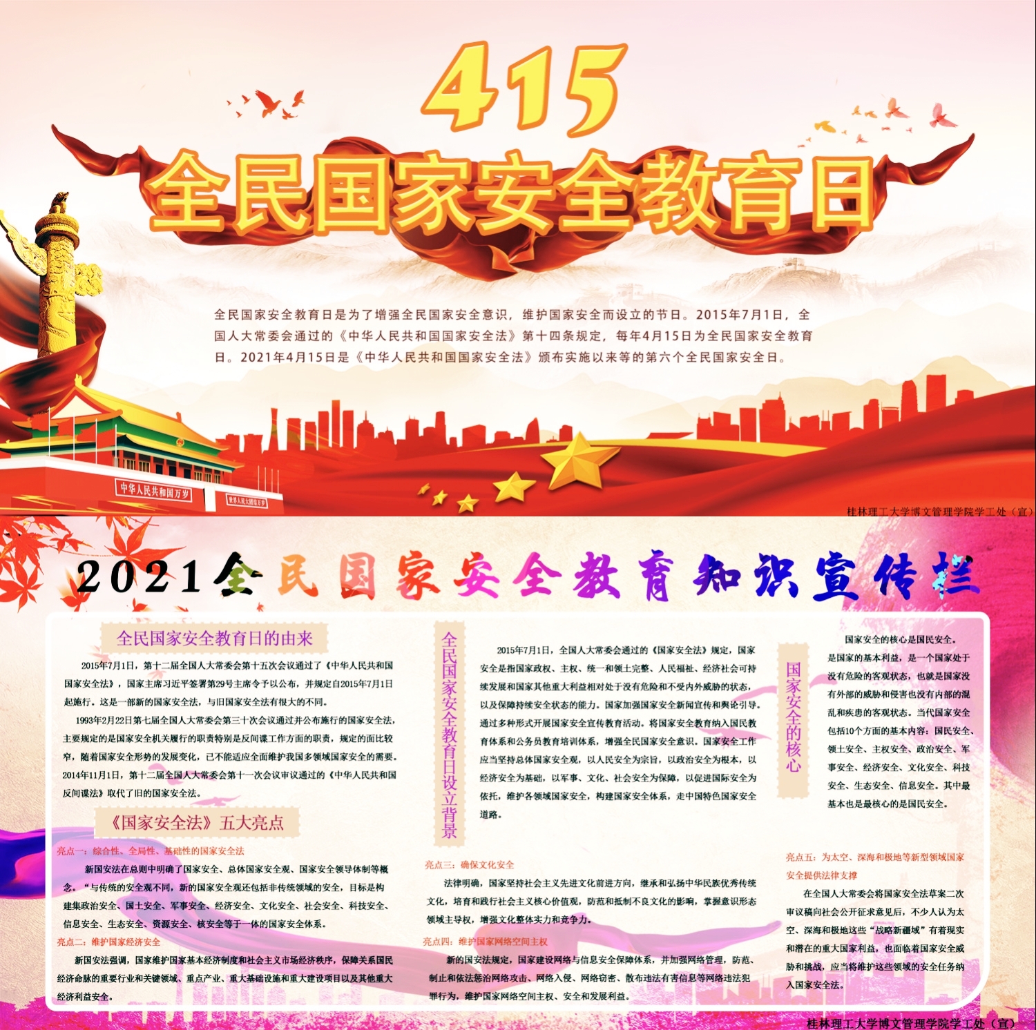 2021年4月15日是《中华人民共和国国家安全法》颁布实施以来的第六个全民国家安全教育日。为推动国家安全教育工作深入开展,增强学生国家安全意识,按照相关工作要求,结合我校疫情防控常态化形势,我校近期组织开展了专题宣传教育活动。