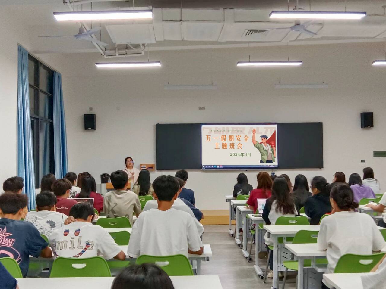 主题班会上,各年级辅导员对2024年五一劳动节放假具体时间进行说明,提醒有计划离校的学生及时购返校车票,及时填写好离返校登记表,严禁出现旷课提前离校等现象;与此同时,辅导员们围绕交通安全,食品安全,财产安全以及防溺水等方面向全体学生提出要求:一是注意防溺水安全,不到无安全设施、无救护人员的水域游泳;二是密切留意天气变化,防范大风、雷暴、冰雹等强对流天气,不到易发生地质灾害的区域游玩;三是遵守交通安全,树牢“一盔一带”安全理念,注意共享单车(滑板车)骑行安全,不酒后驾车;四是注意食品安全,不吃“三无”食品,预防食物中毒;注意财产安全,防范电信网络诈骗及兼职培训恶意贷款;五是针对留校学生要正确使用相关电器,严禁违规使用电器,不通宵熬夜规律作息;六是对于毕业生学生,辅导员通过线上、电话等方式了解学生生活和实习就业情况,加强安全教育,增强学生安全意识。