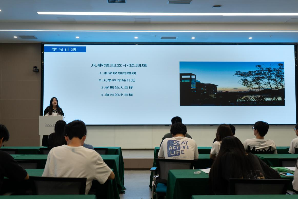 彭莉敏同学从个人情况、校园经历、荣誉展示和实践实习等四个方面向同学们进行了详细介绍和经验分享。特别强调“凡事预则立,不预则废”, 应清晰规划未来路线、制定目标,保持积极向上的态度。同时在找工作的过程中,应敢于开口,不怕被拒绝,勇于自荐,保持自信。