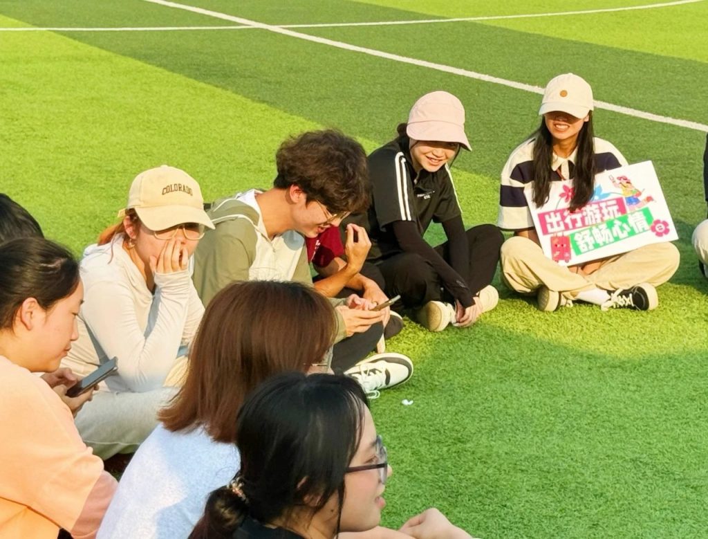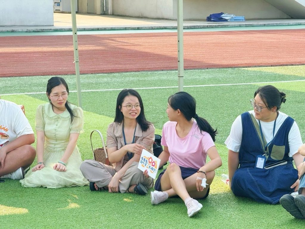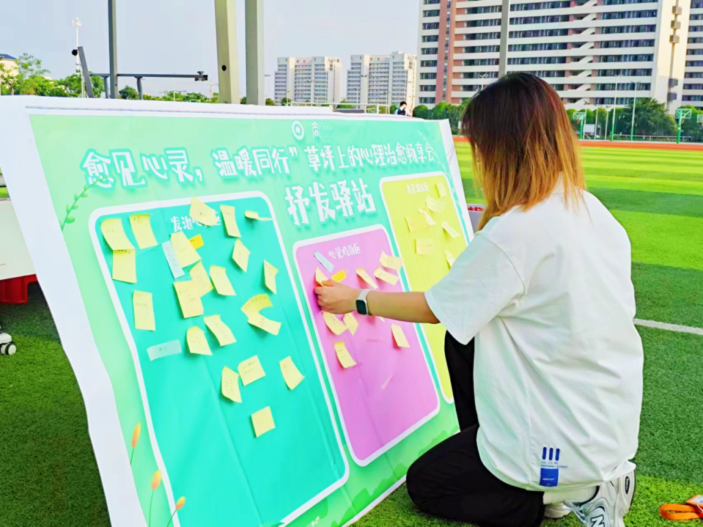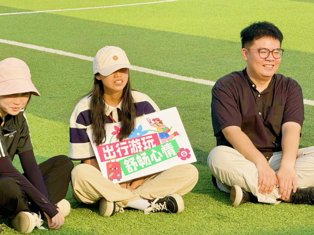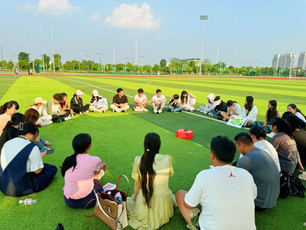本次活动选在校园操场草坪上进行,我们打破传统心灵交流的边界,将清新的草地变身为畅谈的乐园,为同学们与老师之间搭建了一个亲密无间、自然沉浸的氛围空间。在这片绿意盎然的天地间,大家盘腿坐下围成一圈,现场安排了师生之间的“坦诚心里话”交流环节,安排了“声入人心”师生同唱环节,安排了“接地气的接龙游戏”环节等。每一次笑语都伴随着自然的呼吸,每一次分享都满载着纯真的笑容,草坪上,师生共同见证了校园育人环境带来的独特魅力与心灵的滋养,让同学们放松心情,畅所欲言。