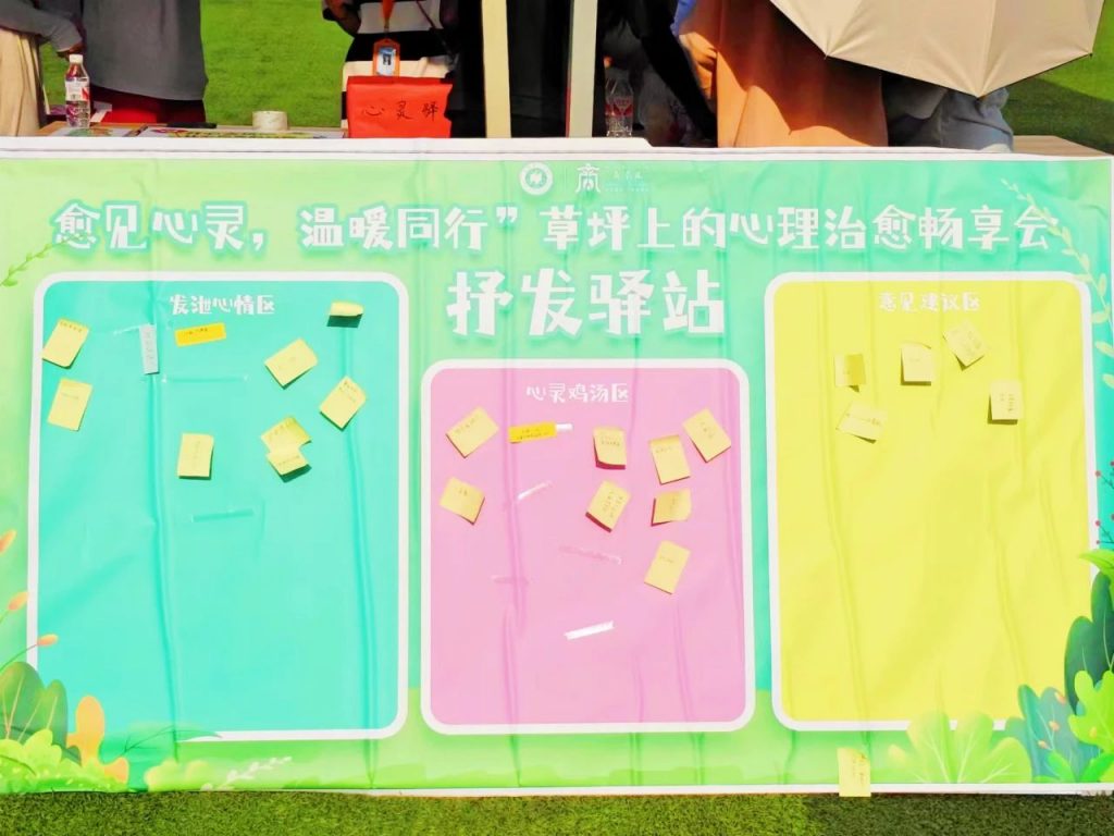 同学们纷纷将自己想分享的好心情或者想丢弃的坏情绪投入此箱,同时,抽取了一份盲盒心情,与陌生朋友的情绪进行对话,并将自己分享的心情拍照,大家都在释放情绪和与陌生人对话中得到治愈。