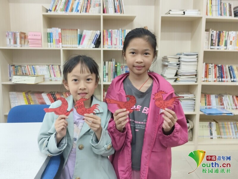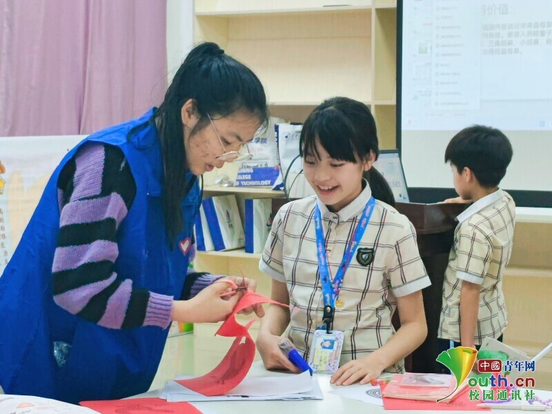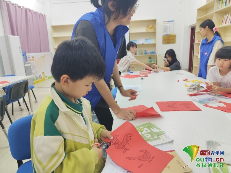 (图为实践成员杨博文现场教学,孩子们进行壮族特色剪纸艺术手工制作)