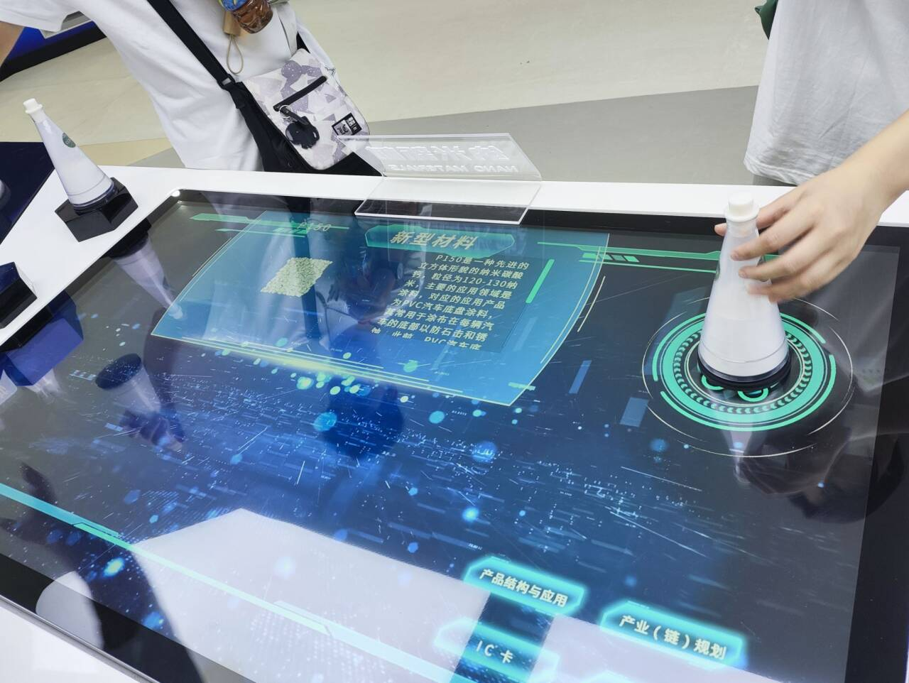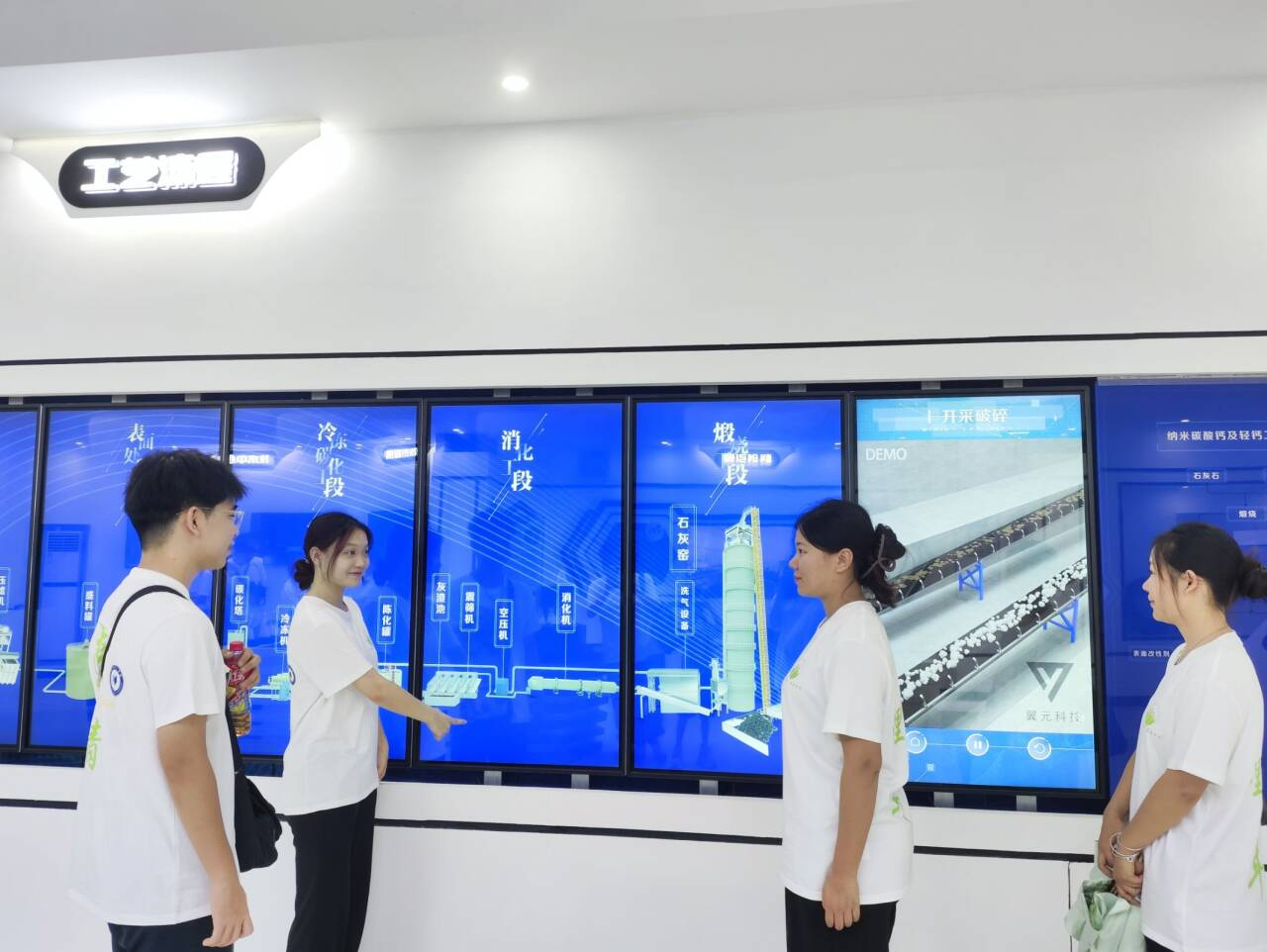 (图为团队成员通过多媒体设备了解华纳纳米钙制作的材料 中国青年网通讯员 龚路 摄)