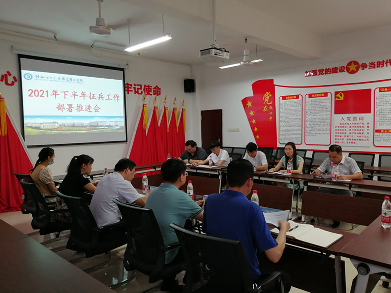 6月11日下午,我校2021年下半年征兵工作部署推进会在教三楼3317会议室召开,党委书记金飞、党委副书记邓雪梅、校长助理冯正垚、学工处处长李枚晏、后勤保卫处处长兼征兵工作站站长钟木生、各二级学院党总支书记、后勤保卫处行政人员参加。会议由学工处处长李枚晏主持。