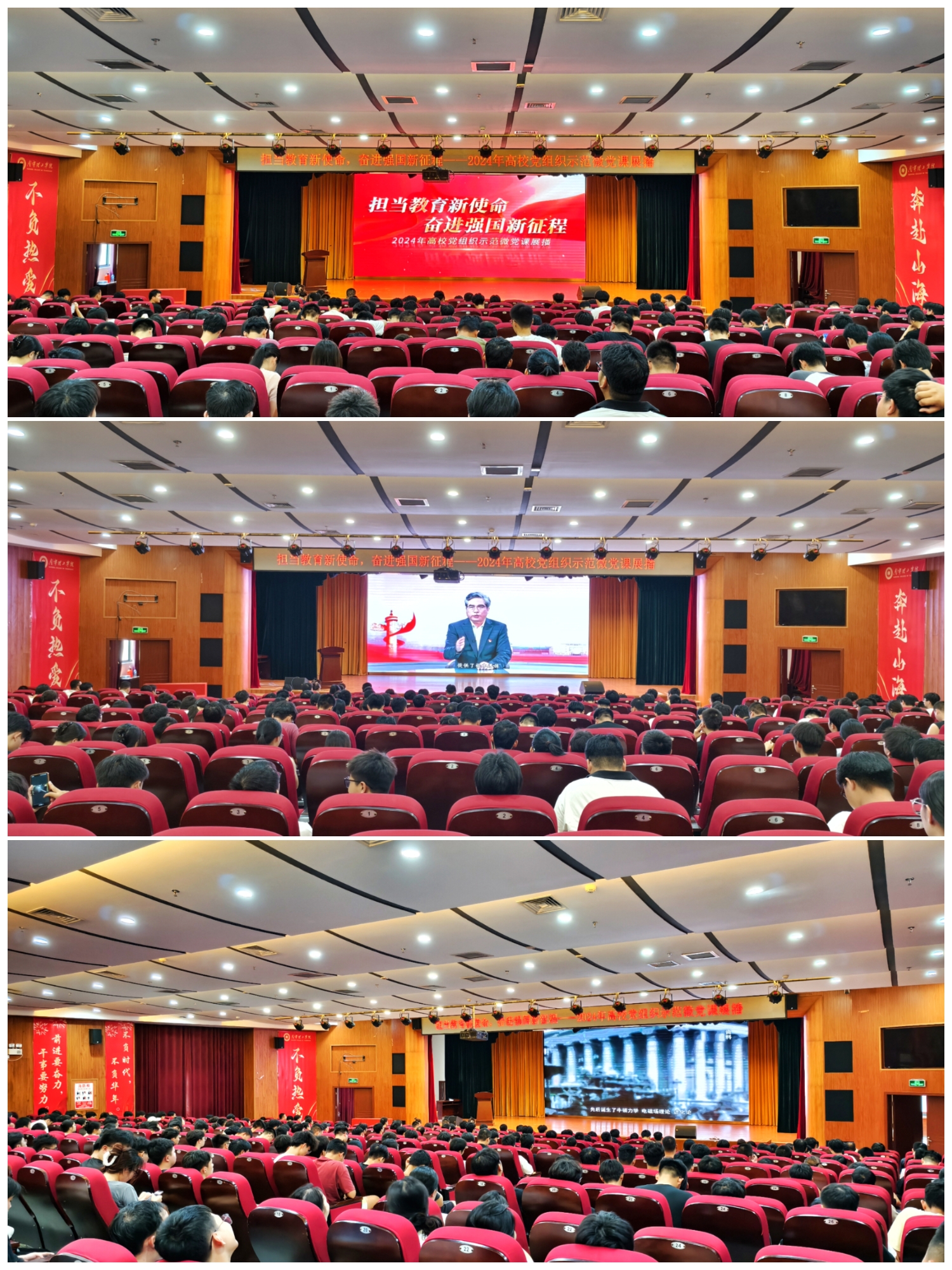 为迎接新中国成立75周年,激发师生奋进强国新征程的强大力量,进一步扎实推进学校人才教育发展,9月4日下午,学生工作部(处)组织两校区辅导员、学生以集中、个人等形式观看“担当教育新使命 奋进强国新征程”2024年高校党组织示范微党课展播第1讲—《坚持教育科技人才“三位一体”,奋力谱写中国式现代化宏伟篇章》。