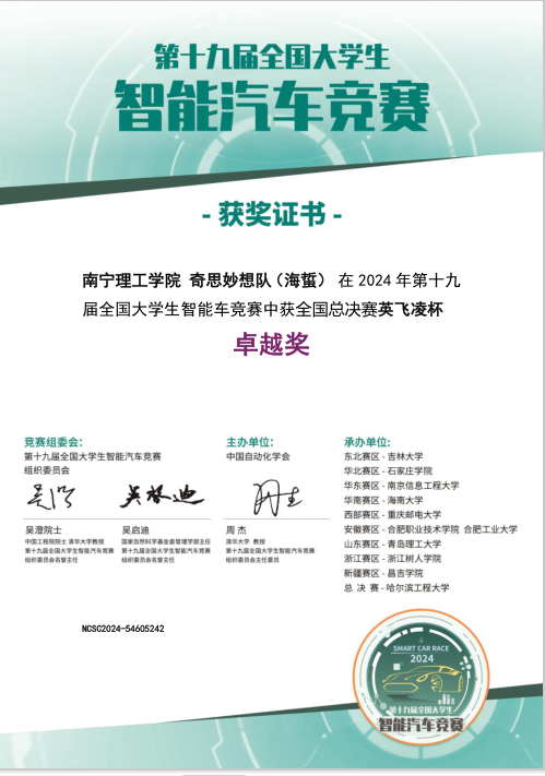 在本届智能汽车竞赛全国总决赛,与全国众多985、211名校同台竞技,第十九届全国大学生智能车竞赛竞速组别共有来自 615 所高校, 2945支队伍参加了分(省)赛区的竞速类十个项目,综合类有四个项目的比赛 。我校越野组“奇思妙想队(海蛰)”在英飞凌杯中获得全国排名第五的成绩,也刷新了我校在本赛道的最好成绩,实现该赛道获奖成绩零的突破,是广西今年唯一获得“英飞凌杯”奖的队伍,华南赛区和全国总决赛,广西所有高校越野组成绩排名均为第一。