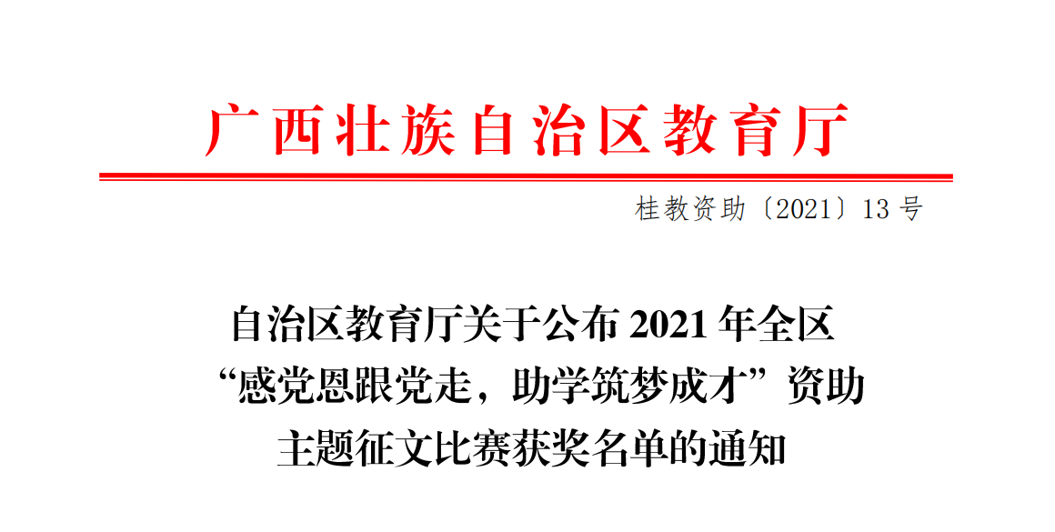 为进一步宣传家庭经济困难学生通过资助政策成长成才的先进事迹,自治区教育厅于2021年5月组织开展了全区“感党恩跟党走,助学筑梦成才”资助主题征文比赛。我校按要求组织开展了校级资助主题征文活动,共征集了246篇由贫困学子创作的征文作品,并最终遴选出两篇优秀作品代表学校参加了自治区的征文比赛。我校学生王晰的作品《向上》荣获了区高校组三等奖荣誉,王梅同学的作品《追光》荣获了区高校组优秀奖荣誉;我校教师史利荣、覃雪娟获得了优秀指导老师荣誉。