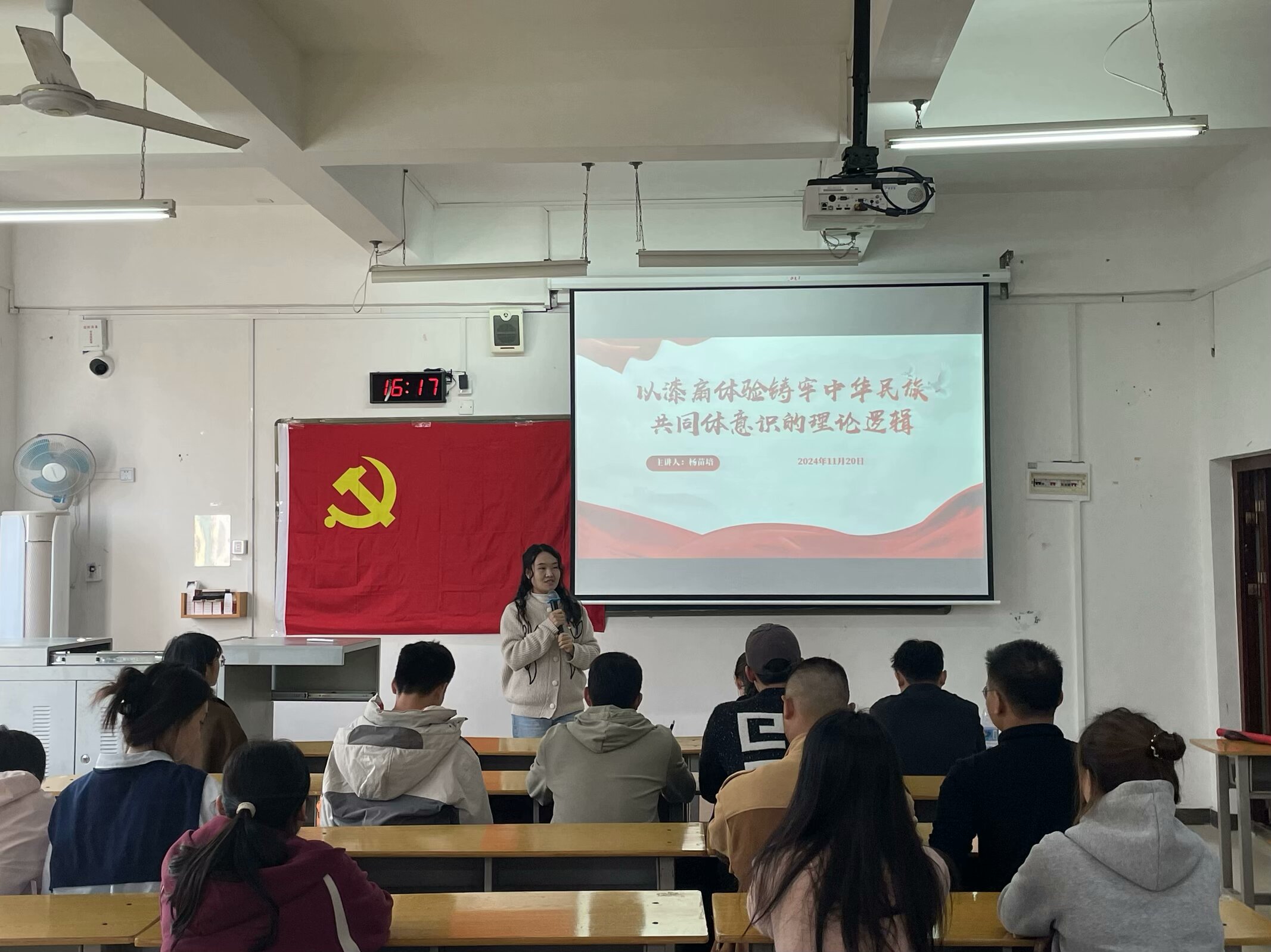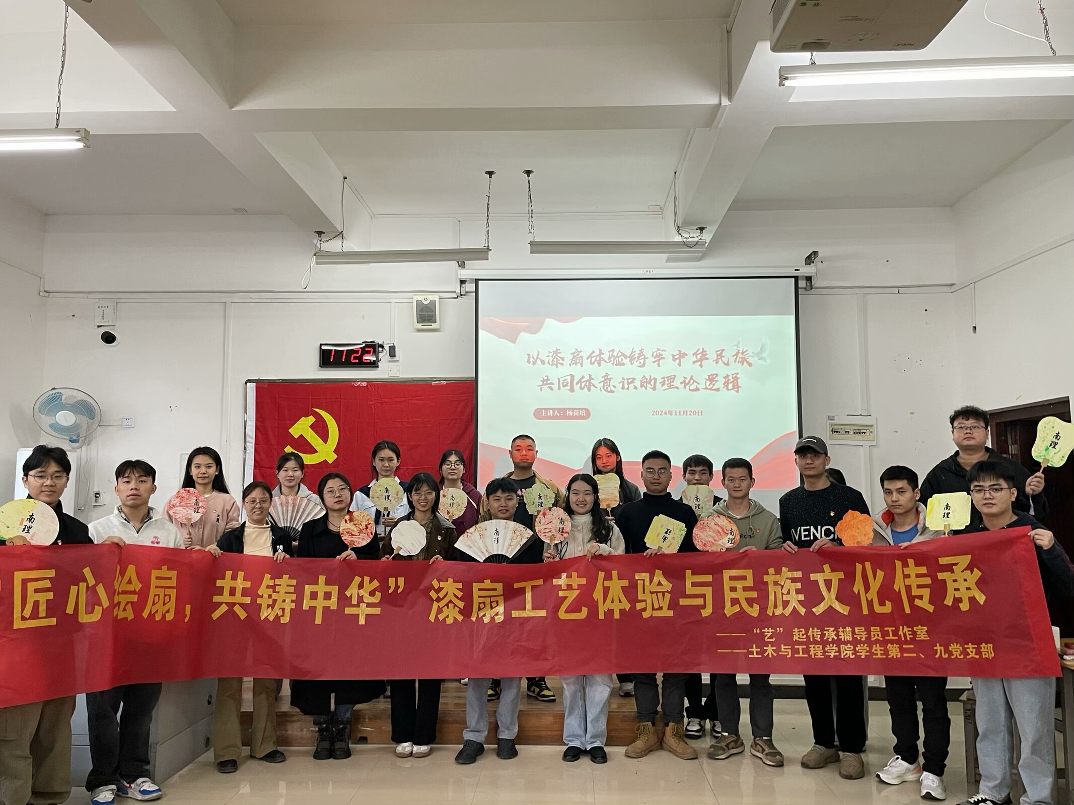 2024年11月20日下午 16:10 分,南宁理工学院“艺”起传承辅导员工作室联合土木与工程学院学生第二、九党支部在1207教室组织开展了一场别开生面的主题党日活动——“匠心绘扇,共铸中华”漆扇工艺体验与民族文化传承。此次活动旨在深入贯彻文化传承理念,将传统漆扇工艺与党员教育相融合,提升党员对民族文化的认知与传承意识。学生第二、九党支部的全体党员共同参与,活动由学生第二党支部书记杨苗培主持。