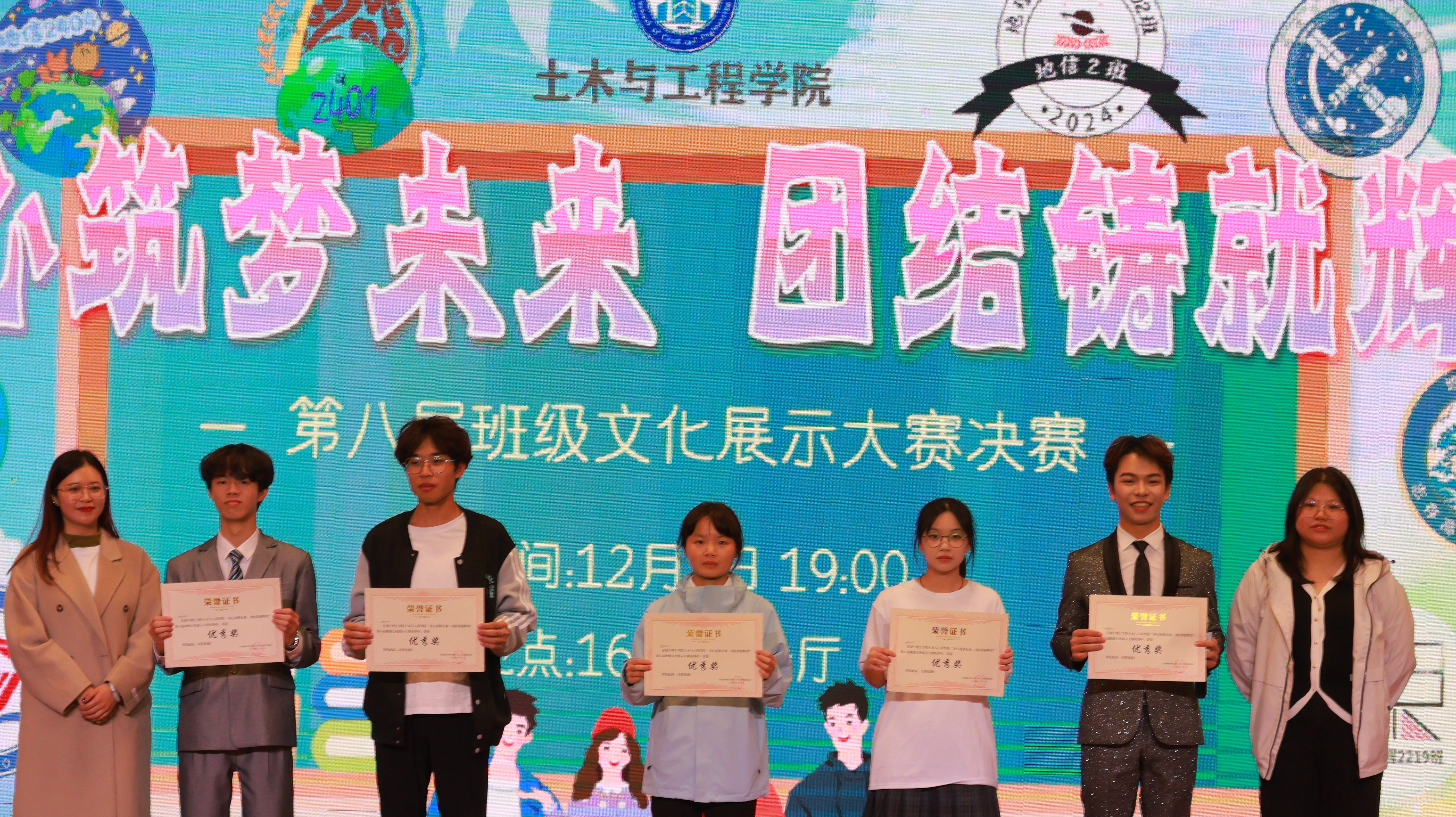 活动开场由院艺术团带来歌曲《违背的青春》活跃现场气氛,各班代表依次通过PPT展示班级的风采,决赛上,各班通过唱歌以及舞蹈的形式展现出班级的团结合作以及朝气蓬勃的精神风貌;舞蹈表演《我乘着风过来》舞动青春华年;从历史硝烟到崭新时代,山河壮丽是不变底色,合唱《歌唱祖国》用激昂旋律,颂华夏风华,展盛世豪情!决赛最后,地信2405班荣获一等奖,地信2401班荣获二等奖,土木2219班荣获三等奖;地信2404班、地信2406班、造价2401班、地信2403班、地信2402班获得优秀奖;最佳人气奖由地信2406班摘得。