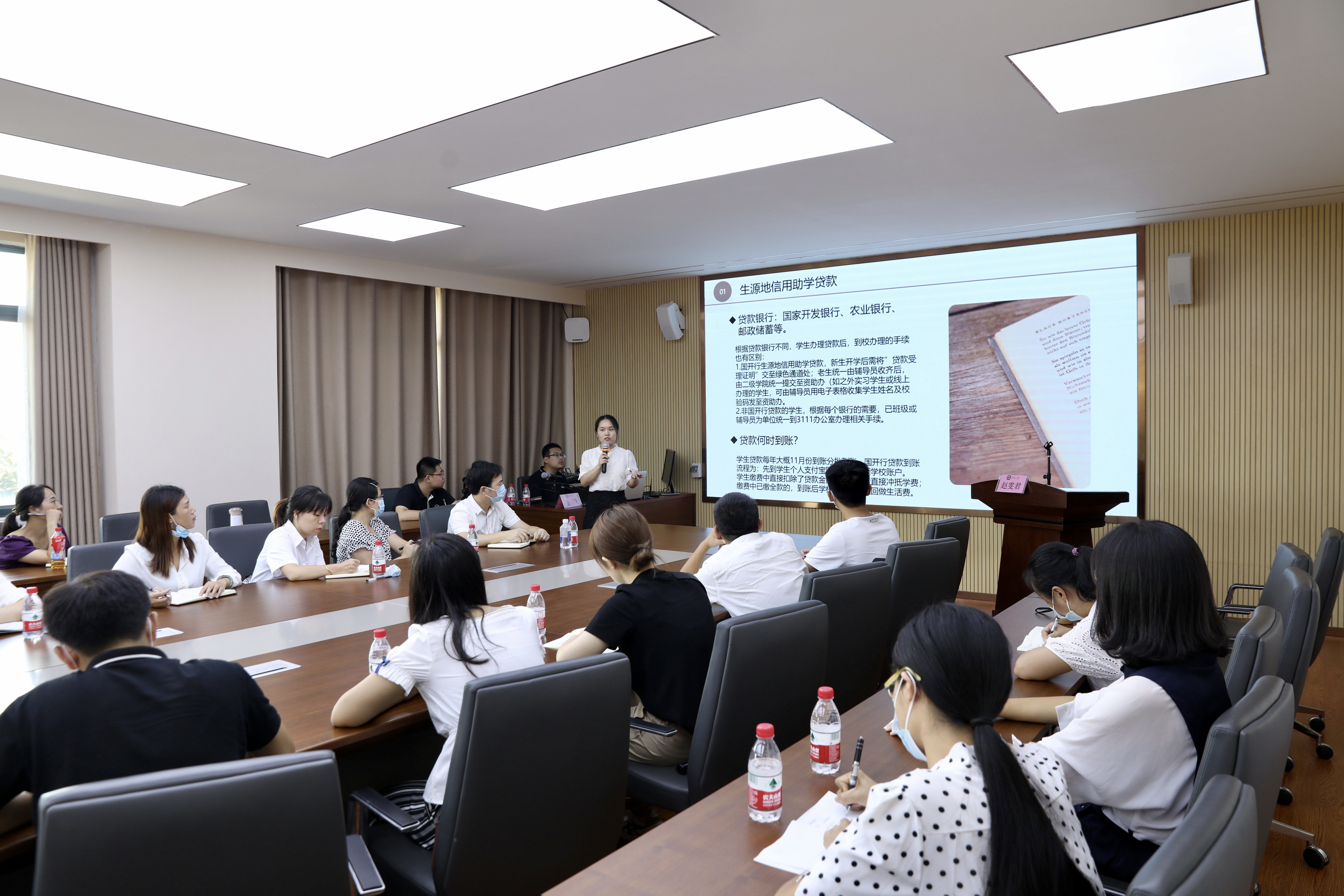培训会上,赵雯君老师为大家讲解了最新的资助政策、相关材料填写、审核标准等要点,内容涵盖生源地信用助学贷款、贫困生认定工作、奖助学金评定、应征入伍补偿、基层就业学费补偿、学生保险六大类。同时,赵老师给各位辅导员提出了三点有关资助工作的建议:一是要提高对资助工作的认识;二是要掌握相关的政策;三是要严格把控各个程序,把资助工作努力做到公平、公正、公开。